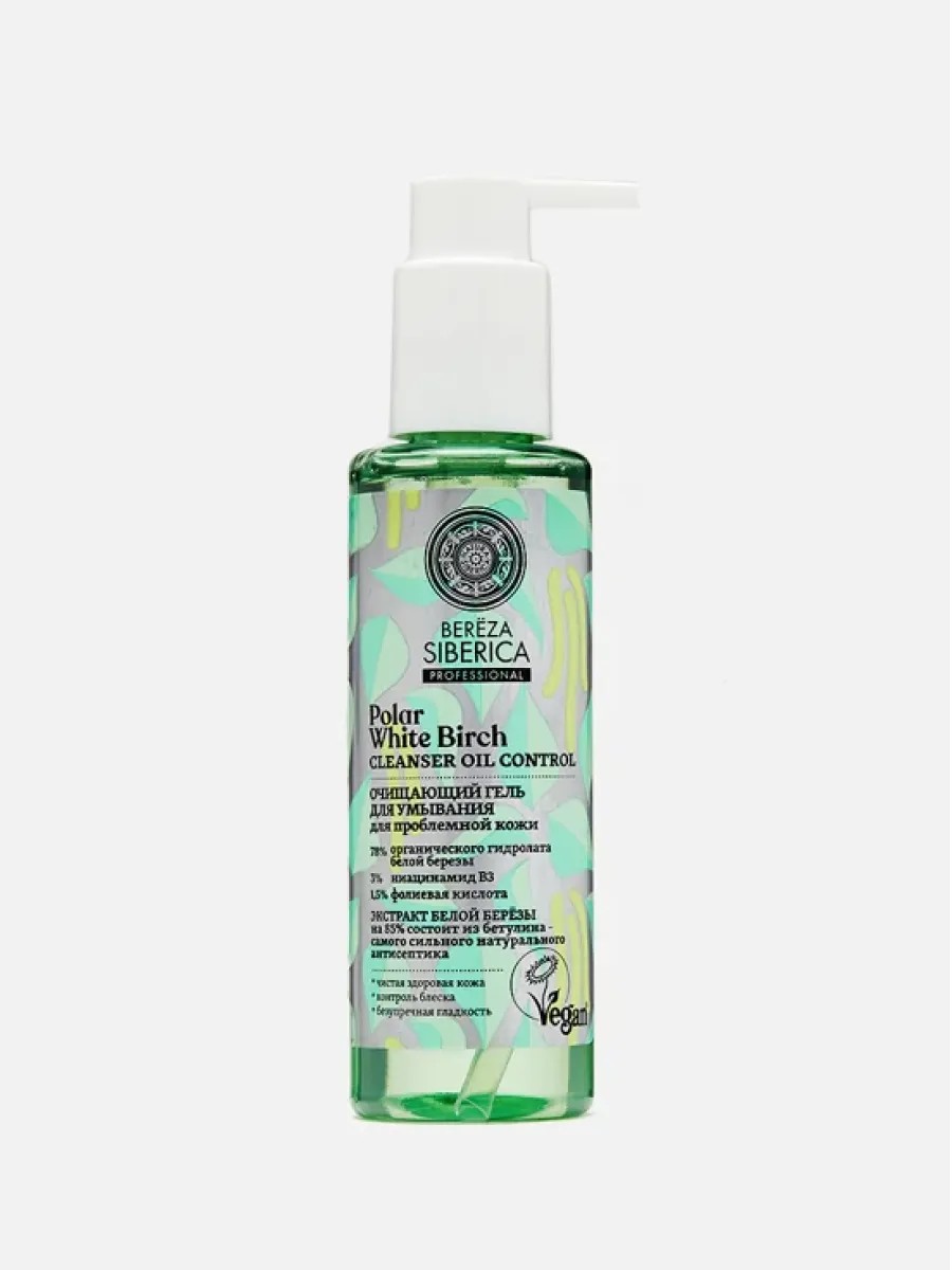 This cleansing gel gently removes impurities and excess sebum, providing shine control while soothing, moisturizing, and leaving skin clean and refreshed. Polar white birch contains several times more betulin than birch growing in temperate latitudes. High concentrations of vitamins B2 and B5 have a strong soothing effect, prevent moisture loss, brighten imperfections, and even out skin tone. BETULIN is known for its powerful anti-inflammatory properties; it effectively soothes irritations, tightens enlarged pores, prevents acne, and enhances the skin's immune system, while simultaneously moisturizing and maintaining a healthy balance. Folic acid has an antibacterial effect, normalizes sebaceous gland function, restores cellular moisture levels, smoothing the skin's texture. Niacinamide B3 improves metabolic processes in the skin, effectively erases traces of post-acne, and evens out skin tone.