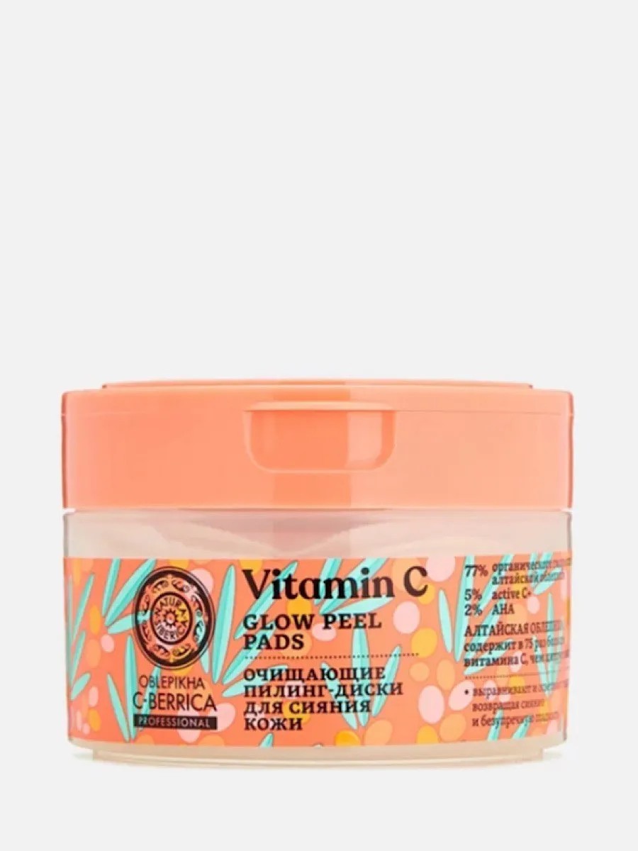 ОЧИЩАЮЩИЕ ПИЛИНГ-ДИСКИ ДЛЯ СИЯНИЯ КОЖИ мгновенно преображают, создавая эффект безупречно гладкой и светящейся изнутри кожи! Нежно очищают, восстанавливая естественный pH кожи, обладают легким пилинг-эффектом, выравнивая тон и текстуру, освежая цвет лица. Органический гидролат алтайской облепихи благодаря высокому содержанию витамина С, ускоряет процессы восстановления, способствует удержанию влаги в коже, возвращая ей упругость и эластичность. Активная форма витамина С «Active C+» подходит даже для чувствительной кожи, отлично воздействуя на верхние слои, защищая от УФ-излучения. АHA-кислоты нормализуют pH кожи и работу сальных желез, отлично отшелушивают, помогают уменьшить гиперпигментацию, улучшая цвет лица.