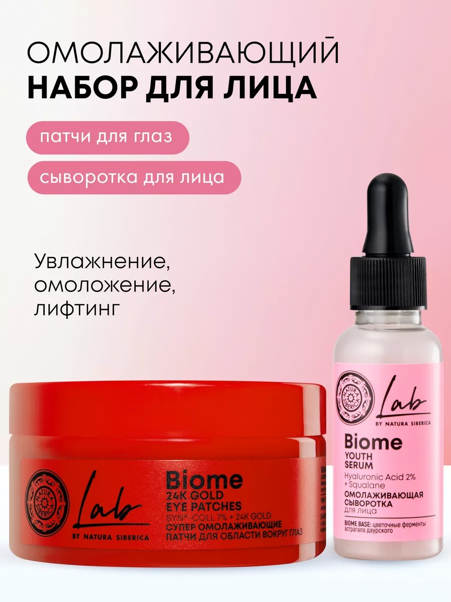 Омолаживающая сыворотка для лица и патчи для глаз Natura Siberica LAB Biome — набор для ежедневного домашнего ухода и восстановления микробиома дермы, направленный на интенсивное увлажнение и подтягивание всех типов взрослой женской кожи.