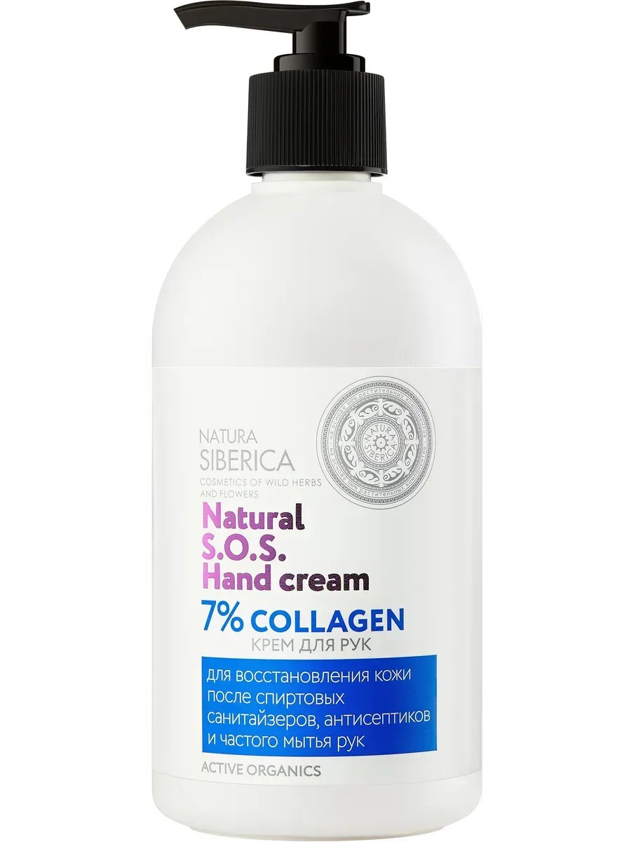 Natura Siberica Natural S.O.S. Hand Cream, 500 ml. The delicate skin of your hands is exposed to repeated daily exposure to harsh factors, such as frequent hand washing and the use of sanitizers, which negatively impacts its natural protective functions. This concentrated hand cream formula with 7% Collagen absorbs quickly, instantly relieving dryness and discomfort, intensely moisturizing the skin, and normalizing its natural protective barrier. Collagen in the cream restores smoothness and elasticity. Organic cedar and blue flax oils deeply nourish and heal, while chamomile, angelica, and Daurian lily extracts soften, soothe, and restore moisture balance, hyaluronic acid intensely moisturizes, and vitamins A and E eliminate flaking and prolong the skin's youthful appearance. Ingredients: Aqua with infusions of Hydrolyzed Wheat Protein (plant collagen), Pinus Sibirica Seed Oil WH* (Siberian cedar oil), Linum Usitatissimum Seed Oil* (blue flax oil), Chamomilla Recutita Flower Extract* (chamomile extract), Angelica Archangelica Root Extract WH* (angelica extract), Lilium Davurica Leaf Extract* (Daurian lily extract), Hesperis Sibirica Flower/Leaf/Stem Extract WH* (Siberian evening primrose extract); Cetearyl Alcohol, Glyceryl Stearate, Cocos Nucifera Oil (coconut oil), Coco-Caprylate/Caprate, Sodium Hyaluronate (hyaluronic acid), Retinol Palmitate (vitamin A), Tocopherol (vitamin E), Xanthan Gum, Sodium Stearoyl Glutamate, Benzyl Alcohol, Potassium Sorbate, Sodium Benzoate, Parfum, Lilyall, Limonene, Citral. * - organic ingredients WH organic extracts of wild Siberian plants. Apply a small amount of cream to dry, clean skin of your hands and spread until completely absorbed.