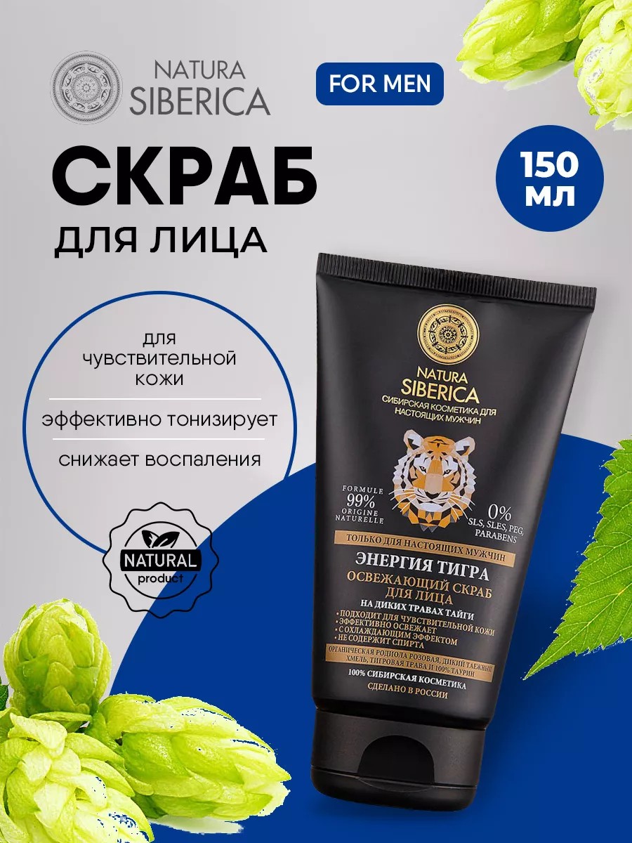 Natura Siberica Men Энергия тигра Скраб для лица Освежающий 150мл. Забота о коже лица включает в себя не только ежедневное очищение и основной уход, но также и дополнительный уход. Скраб для лица на диких травах тайги органической косметики siberica прекрасно справляется с функцией доп ухода. Входящая в состав освежающего скраба органическая родиола розовая положительно воздействует на чувствительную кожу, снижает воспаления, обеспечивает защиту. Тигровая трава вместе с диким таежным хмелем обогатит энергией и подарит уверенность в себе, как никогда раньше! 100% таурин эффективно тонизирует, даря заряд молодости и силы. Адаптогены – уникальные растения, обладающие поразительной жизненной силой и энергией. Пережив Ледниковый период они доказали, что способны расти даже в самых суровых условиях при экстремальных температурах, накапливая в себе необходимые биологически активные вещества, способствующие улучшению общего состояния и замедлению процессов старения кожи. Способ применения: Нанесите скраб сиберика на лицо массирующими движениями, смойте водой. Для наилучшего результата используйте 2-3 раза в неделю.