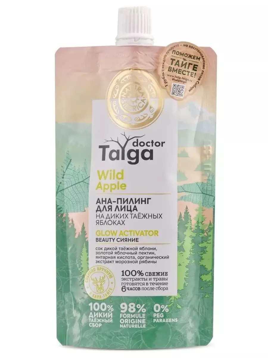 Doctor Taiga, АНА-пилинг для лица «Beauty сияние», 100 мл. За несколько минут обновляет и возвращает здоровое сияние коже. Подходит для использования в холодное время года, когда особенно нужен деликатный уход. Мгновенно улучшает цвет лица. Наполняет энергией и сиянием. Кожа выглядит свежей и отдохнувшей дикая таёжная яблоня содержит в 2 раза больше витамина с, чем ананас. Сок дикой таежной яблони содержит АНА кислоты, которые эффективно отшелушивают и стимулируют выработку коллагена в клетках кожи. Яблочный пектин выводит токсины, тонизирует и способствует обновлению на клеточном уровне. Янтарная кислота эффективно очищает, избавляет от черных точек, выводит лишнюю влагу и стимулирует обменные процессы. Морозная рябина возвращает коже упругость и эластичность. Способ применения: нанести пилинг на чистую сухую кожу лица массирующими движениями, избегая области вокруг глаз. Через 10-15 минут смойте теплой водой. Используйте не чаще 1 раза в неделю.