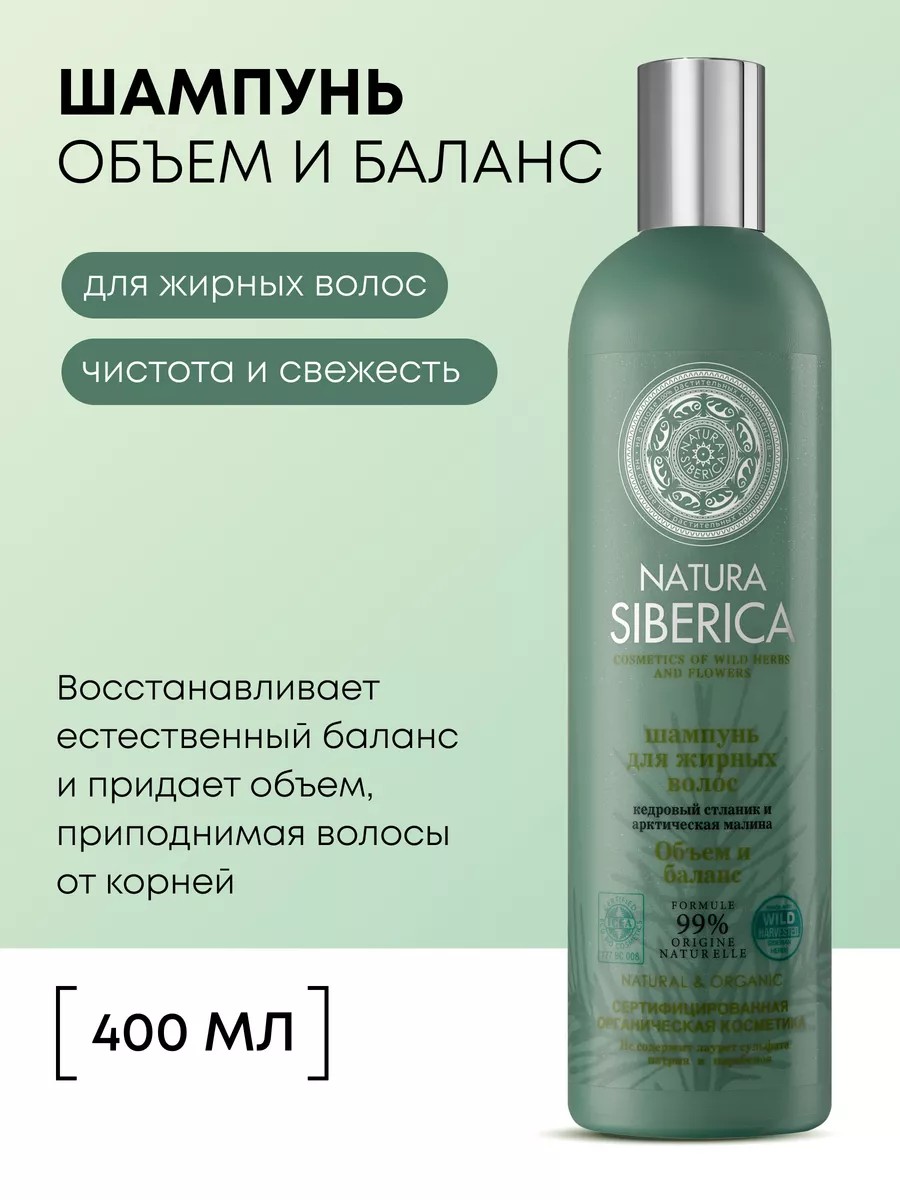 Балансирующий шампунь для жирных волос «Объем и баланс» Natura Siberica 400 мл надолго сохраняет прикорневой объем, чистоту и свежесть. Обогащенный бессульфатный состав обеспечивает бережное очищение, мягко ухаживает за прядями и оказывает на кожу головы себорегулирующее действие. Подходит для ежедневного использования, для бани и на каждый день.
