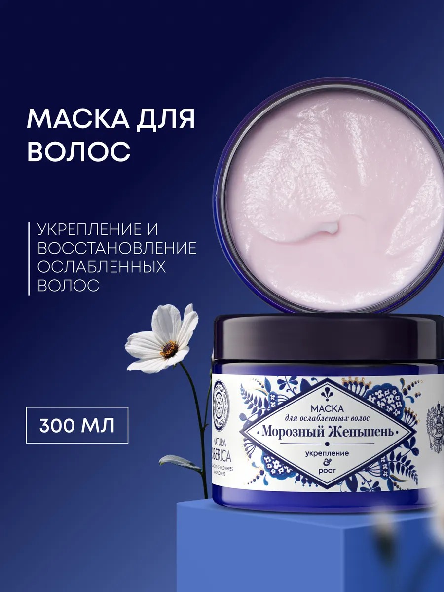 Natura Siberica Gzhel "Frosty Ginseng" Hair Mask for Weak and Fine Hair, 300 ml, is designed to strengthen, restore, and reconstruct the fragile porous structure.