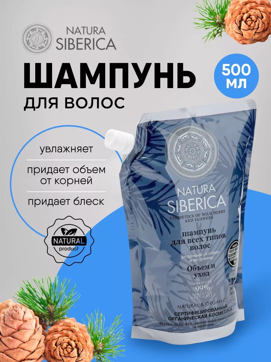 Natura Siberica Volume and Care Shampoo for All Hair Types, 500ml Doy-Pack. The product is presented in a flexible packaging. Siberica shampoo contains dwarf pine and taiga lungwort. The taiga lungwort extract perfectly protects hair from moisture loss and imparts radiant shine. This organic shampoo contains dwarf pine, a coniferous plant with many beneficial properties. It is used in shampoos for its antiseptic and anti-inflammatory properties. Dwarf pine helps fight dandruff, itching, and scalp irritation, and also strengthens hair and stimulates its growth. Four vitamins (A, B, C, and E) contained in lungwort provide long-lasting protection and gentle care. Directions for use: Apply Siberica shampoo to damp hair, massage into a lather, rinse with water, and repeat if necessary.
