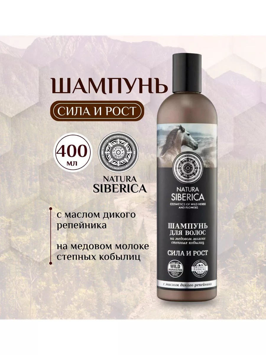 Шампунь для волос Сила и Рост на медовом кумысе подарит здоровье и силу вашим волосам, укрепляет волосы по всей длине, насыщает их аминокислотами, способствует выработке собственного коллагена. Масло дикого репейника ускоряет рост волос, делает их сильными и эластичными. Постоянное применение шампуня способствует росту здоровых волос, укреплению и восстановлению каждого волоса по всей длине изнутри и снаружи.Формула не содержит сульфатов, парабенов и силиконов, создана для мягкого и бережного ухода за вашими волосами и кожей головы."В нашей косметике мы используем собранные вручную в естественных условиях своего произрастания растения, травы и ягоды.Способ применения: нанесите небольшое количество шампуня на влажные волосы. Вспеньте и немного помассируйте, затем смойте тёплой водой. При необходимости повторите процедуру.