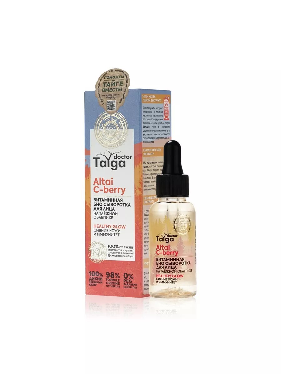 This vitamin serum awakens the skin's protective properties, stimulates cell renewal, and provides reliable protection in urban conditions. Skin appears smooth, firm, and radiant. Intensively moisturizes. Provides a healthy glow. Instant transformation: skin full of energy and vitality. TAIGA SEA BUCKTHORN – A SUPERFOOD FOR RADIANT SKIN. Taiga sea buckthorn is a source of vitamins A, E, and C, instantly restoring radiance and elasticity to the skin. Vitamin ACTIVE C+ is a vitamin C formula supplemented with bioflavonoids. It has a powerful antioxidant effect and increases collagen synthesis in skin cells. Fresh wild lingonberry juice is a source of ursolic acid, which helps maintain skin tone. Organic Daurian rosehip extract strengthens the skin's protective properties, slows the aging process, deeply nourishes and moisturizes.