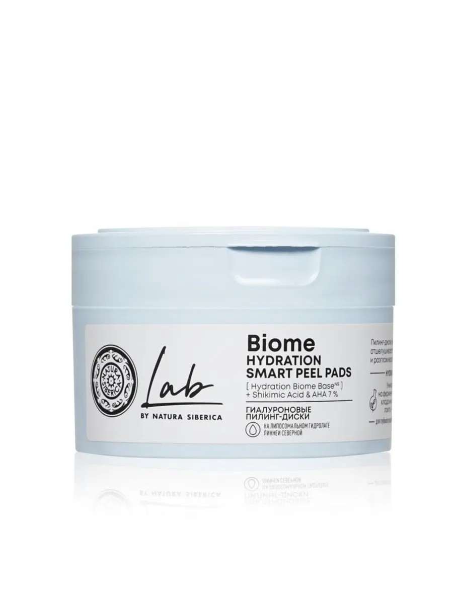 Пилинг-диски эффективно очищают и мягко отшелушивают кожу. Глубоко увлажняют и разглаживают микрорельеф, повышая упругость и эластичность кожи.Hydrasib Biome Base. Уникальная биом-база в линейке Лаб Биом на ферментированном экстракте кладонии снежной с лизатами лакто- и бифидобактерий создана для глубокого увлажнения и укрепления иммунитета кожи.Активные ингредиенты:Шикимовая кислота абсорбирует загрязнения, выравнивает тон и уменьшает гиперпигментацию.AHA кислоты отлично отшелушивают и обновляют кожу, улучшая цвет лица.4D гиалуроновая кислота увлажняет и защищает кожу от дегидратации на всех уровнях.