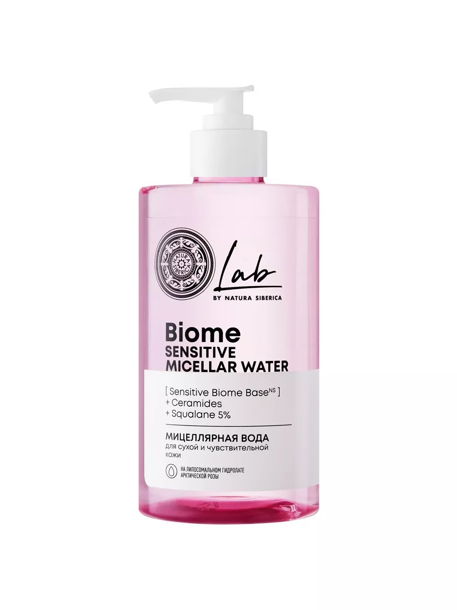 Natura Siberica LAB Biome Sensitive micellar water for dry and sensitive skin, with liposomal arctic rose hydrosol, gently removes makeup and impurities from the face, eyes, and lips.