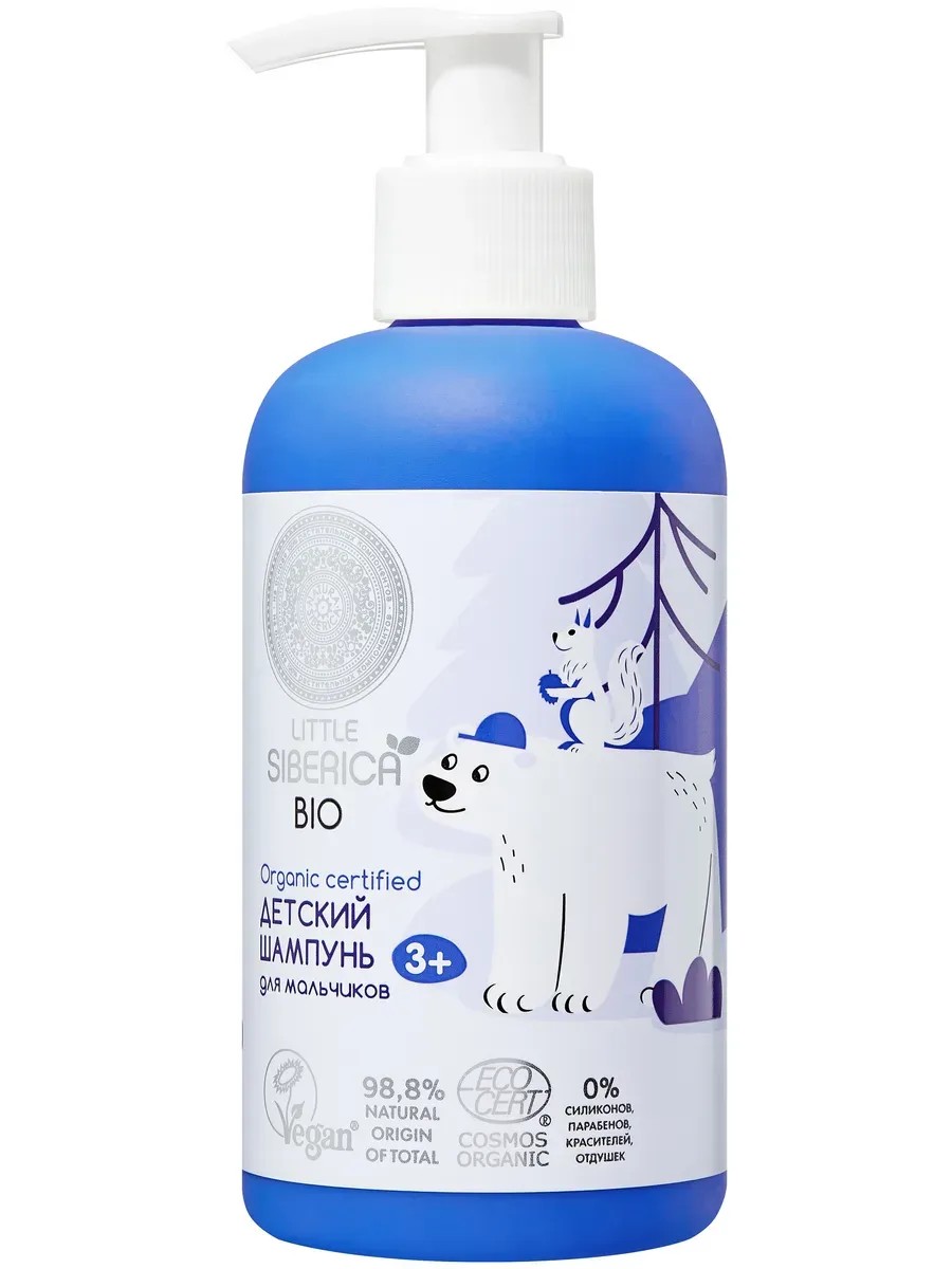 Natura Siberica Little Shampoo for Boys, 250 ml. Children's shampoo for boys. What makes our shampoo different from others? We use organic hydrolates of Siberian plants, a concentrated cocktail of vitamins and microelements obtained through distillation. Unlike shampoos made with regular water, it not only gently cleanses but also cares for the hair and scalp. Active ingredients: Organic Siberian cedar hydrolate cares for hair, restoring its structure. Organic calendula and linden extracts care for the scalp. We care about your safety. COSMOS ORGANIC certified by ECOCERT GREENLIFE in accordance with the COSMOS standard. 98.8% of all ingredients are of natural origin. 10.83% of all ingredients are of organic origin. The product does not contain harmful chemical components: parabens, SLES, SLS, fragrances, and dyes. Ingredients: Aqua, Melilotus Albus Flower/Leaf/Stem Extract*, Sodium Coco-Sulfate, Lauryl Glucoside, Coco-Glucoside, Iris Sibirica Root ExtractWH*, Agrostis Stolonifera ExtractWH*, Tilia Cordata Flower Extract*, Pinus Sibirica Needle Water*, Calendula Officinalis Flower ExtractWH*, Rosa Canina Fruit Oil*, Glyceryl Oleate, Sodium Chloride, Benzyl Alcohol, Sodium Benzoate, Potassium Sorbate, Citric Acid. (*) - Organic ingredients (WH) Organic extracts and oils of wild-growing Siberian plants. Apply a small amount to damp hair, lather, rinse with warm water.