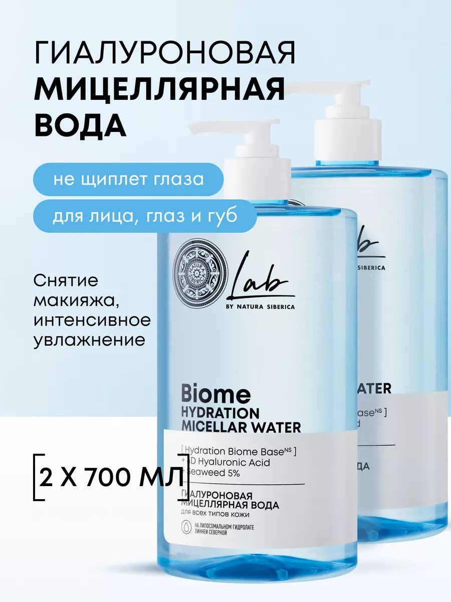 Гиалуроновая мицеллярная вода Natura Siberica LAB Biome Hydration micellar water 700 мл — не только очищающее, но и ухаживающее средство для умывания. Обеспечивает бережное удаление стойкой водостойкой косметики, смывание туши и загрязнений вокруг глаз, губ и бровей, натуральных и нарощенных ресниц. Дает увлажнение и поддерживает баланс микробиома. Жидкость для снятия макияжа без масел деликатно очищает поры, не вызывает раздражений, сухости и шелушений. Является универсальной для очистки всех типов женской кожи. Подойдет для жирной и проблемной, очень сухой, нормальной и смешанной, комбинированной и чувствительной.
