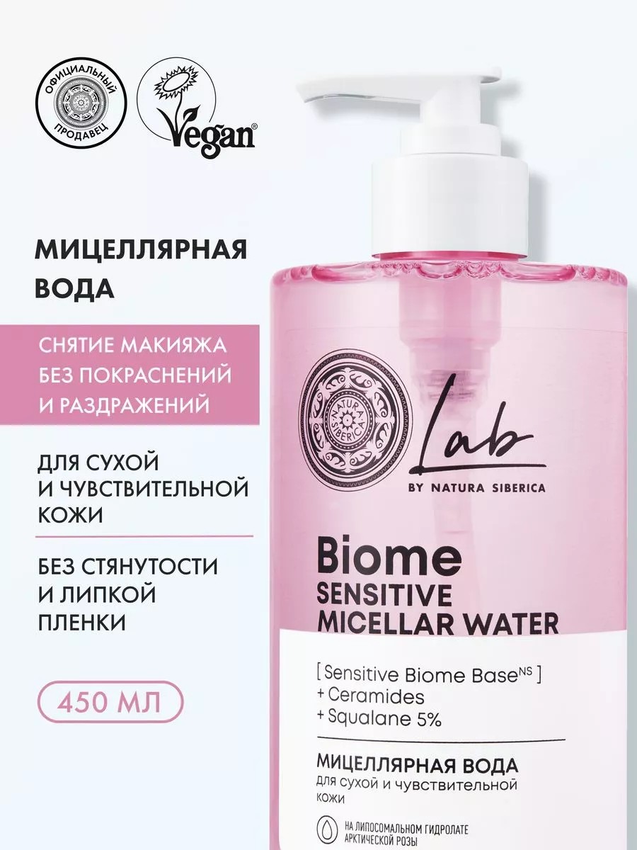 Мицеллярная вода для сухой и чувствительной кожи Sensitive Biome Base от Natura Siberica LAB на липосомальном гидролате арктической розы — это очищающее средство для бережного удаления стойкой и водостойкой косметики. Гипоаллергенная мицеллярка просто и деликатно очищает поры, не вызывая раздражения, увлажняет и успокаивает склонный к покраснениям эпидермис. Обеспечивает смывание туши, макияжа губ, бровей, натуральных и нарощенных ресниц, загрязнений вокруг глаз без аллергии. Оказывает нежный ухаживающий результат — уменьшает сухость, поддерживает баланс микробиома и сияние чистой кожи.