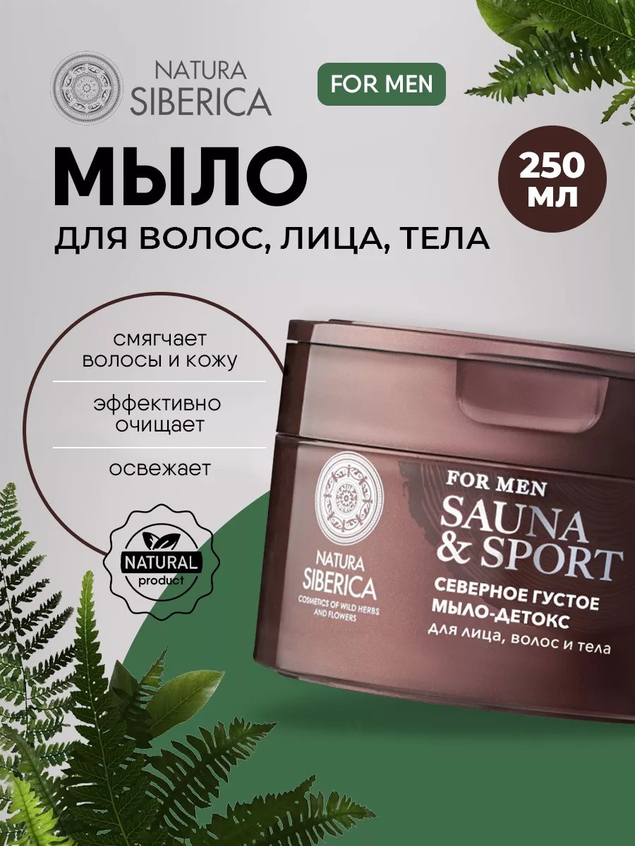 Natura Siberica Men Sauna & Sport Густое северное мыло-детокс для лица, волос и тела 250мл. Натуральное густое мыло-детокс для лица, волос и тела Natura Siberica Men Sauna & Sport — идеальный уход для мужчин в традициях сибирской бани. Экстракт байкальского шлемника в мыле сиберика Men Sauna & Sport оказывает успокаивающее действие на кожу, снимает раздражение и воспаление, а также способствует регенерации клеток кожи. Экстракт тундрового папоротника обладает антиоксидантными свойствами, защищает кожу от свободных радикалов и стимулирует обновление клеток. Экстракт герани в мыле обладает антибактериальным и укрепляющим действием на кожу тела. Siberica для мужчин помогает восстановить и укрепить кожу и волосы, обеспечивая истинное возрождение тела, разума и духа. Способ применения: нанести мыло на влажные волосы, кожу лица и тела, слегка помассировать и смыть водой.