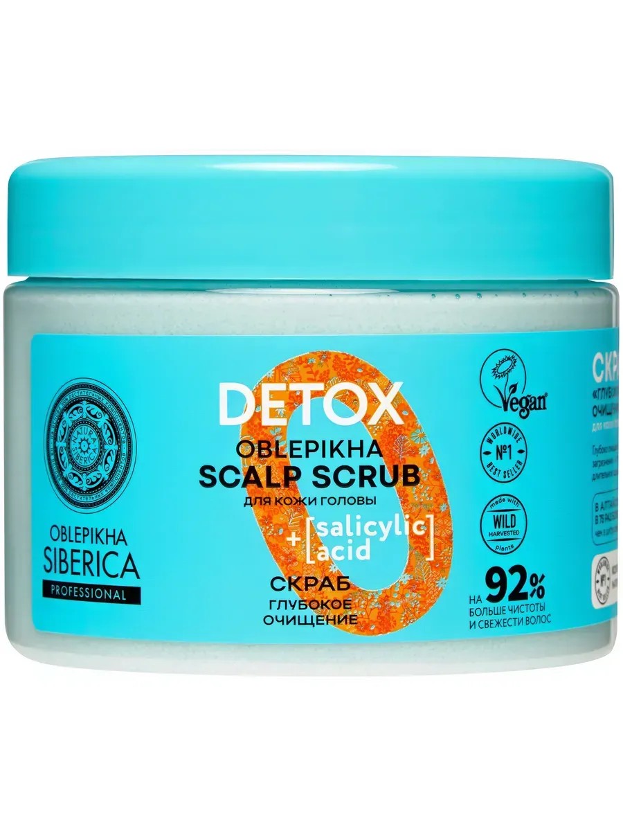 Natura Siberica Detox Oblepikha Scalp Scrub Siberica Professional Deep Cleansing Scalp Scrub, 400 g. Deeply cleanses and regenerates the scalp, removes dead skin cells, and removes impurities and styling product residue. Provides a long-lasting feeling of freshness and cleanliness. Salicylic acid absorbs impurities and excess sebum. Altai sea buckthorn oil soothes and relieves irritation. Wild mint, Siberian juniper, and angelica improve microcirculation and stimulate hair growth. Pro-Liposome, a unique system for transporting active ingredients into the hair and scalp. Ingredients: Sodium Chloride, Glycerin, Cocamidopropyl Betaine, Sodium Cocoyl Isethionate, Mentha Piperita Leaf Extract, Juniperus Sibirica Needle Extract, Angelica Archangelica Root Extract, Rubus Chamaemorus Seed Extract, Aralia Mandshurica Root Extract*, Rhodiola Rosea Root Extract, Artemisia Arctica Flower/Leaf/Stem Water; Salicylic Acid, Phospholipids, Guar Hydroxypropyltrimonium Chloride, Parfum, CI 42051. *Organic ingredients. WH Organic extracts of wild plants from Siberia Apply the product to the root zone with light massaging movements, then rinse thoroughly with shampoo.