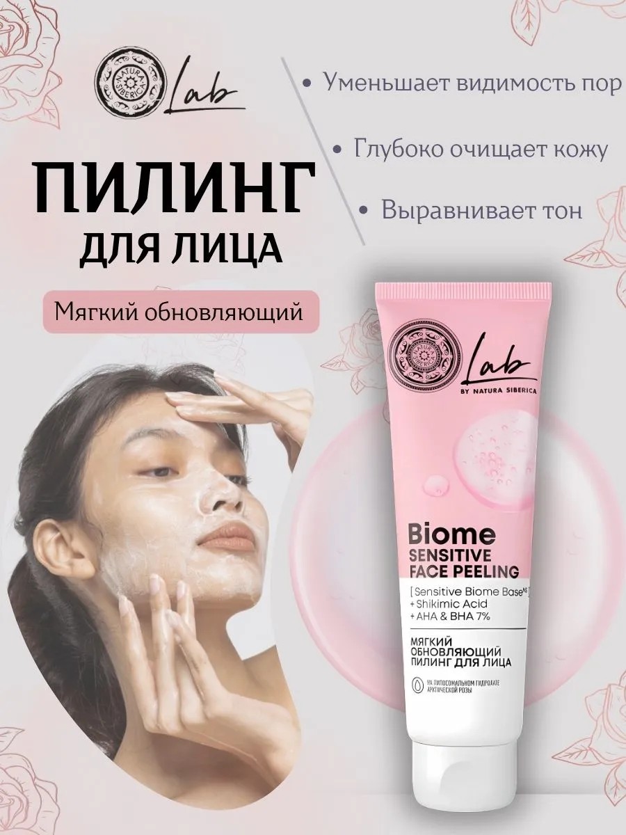 Мягкий обновляющий пилинг для лица Natura Siberica LAB Biome Sensitive, 100 мл.на липосомальном гидролате арктической розы глубоко очищает кожу, абсорбируя загрязнения и ороговевшие клетки эпидермиса. Уменьшает видимость пор и выравнивает тон.