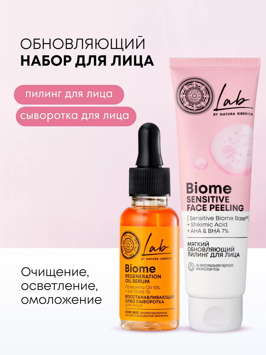 Набор обновляющий пилинг и сыворотка для лица на основе ферментов и кислот Natura Siberica LAB Biome дает комплексный уход за кожей. Пилинг глубоко очищает, осветляет, а сыворотка восстанавливает и способствует омоложению на всех уровнях — кожа станет гладкой, сияющей и здоровой.