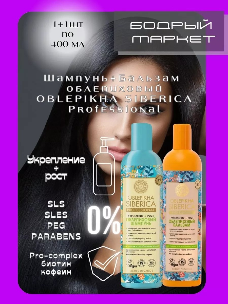 Shampoo + Conditioner Set. Volume: 400 ml. Restores the structure of damaged hair. Seals the hair surface with a protective layer. Makes hair thicker and fuller. Facilitates combing. Intensively restores damaged hair structure and protects against heat damage during hot styling. Ideal for weakened, colored, and highlighted hair, as well as permed hair. Seals the hair surface with a protective layer, creating a laminating effect, smoothes and thickens the hair, making combing easier. Vitamins and amino acids contained in the balm nourish and restore hair. Seals the hair surface with a protective layer, creating a laminating effect, smoothes and thickens the hair, making combing easier. After using the balm, hair becomes noticeably smoother, more elastic, and manageable. Altai sea buckthorn oil and Moroccan argan oil promote keratin formation, which provides hair with strength and shine. Snow cladonia, arctic rose, and white Siberian flaxseed oil retain moisture deep within the hair structure.