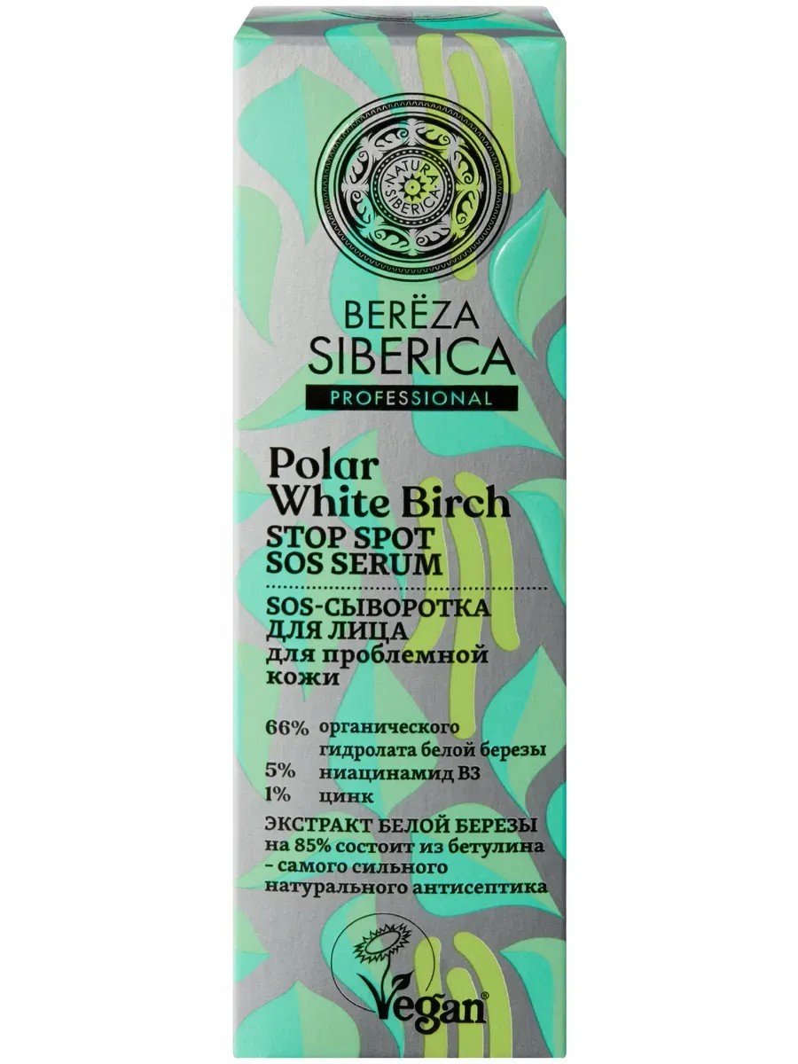 Natura Siberica Bereza Siberica SOS Serum, 30 ml. This SOS facial serum effectively eliminates localized imperfections, preventing the appearance and development of acne and blackheads, soothes, tightens pores, and evens out skin tone. Polar white birch contains several times more betulin than birch growing in temperate latitudes. High concentrations of vitamins B2 and B5 have a strong soothing effect, prevent moisture loss, brighten imperfections, and even out skin tone. BETULIN is known for its powerful anti-inflammatory properties; it effectively soothes irritations, tightens enlarged pores, prevents acne, and enhances the skin's immune system, while simultaneously moisturizing and maintaining a healthy balance. Niacinamide B3 improves metabolic processes in the skin, effectively erases traces of post-acne, and evens out skin tone. Zinc dries out inflammatory lesions and prevents the formation of blackheads. Ingredients: Aqua with infusions of Betula Alba Bark Water WHHH (organic white birch hydrolate), Betula Alba Bark Extract WH* (white birch extract), Hesperis Sibirica Flower/Leaf/Stem Extract WH* (Siberian violet extract), Scutellaria Baicalensis Root Extract* (Baikal skullcap extract), Chamomilla Recutita Flower Extract* (chamomile extract), Calendula Officinalis Flower Extract* (calendula extract); Niacinamide (vitamin B3), Heptyl Glucoside, Glycerin, Zinc PCA, Xanthan Gum, Salicylic Acid, Sodium Hyaluronate, Panthenol, Lactic Acid, Benzyl Alcohol, Sodium Benzoate, Potassium Sorbate, Parfum, Butylphenyl Methylpropional, Alpha-Isomethyl Ionone. Apply a small amount of serum to the entire face or spot on acne-forming areas, then apply cream.