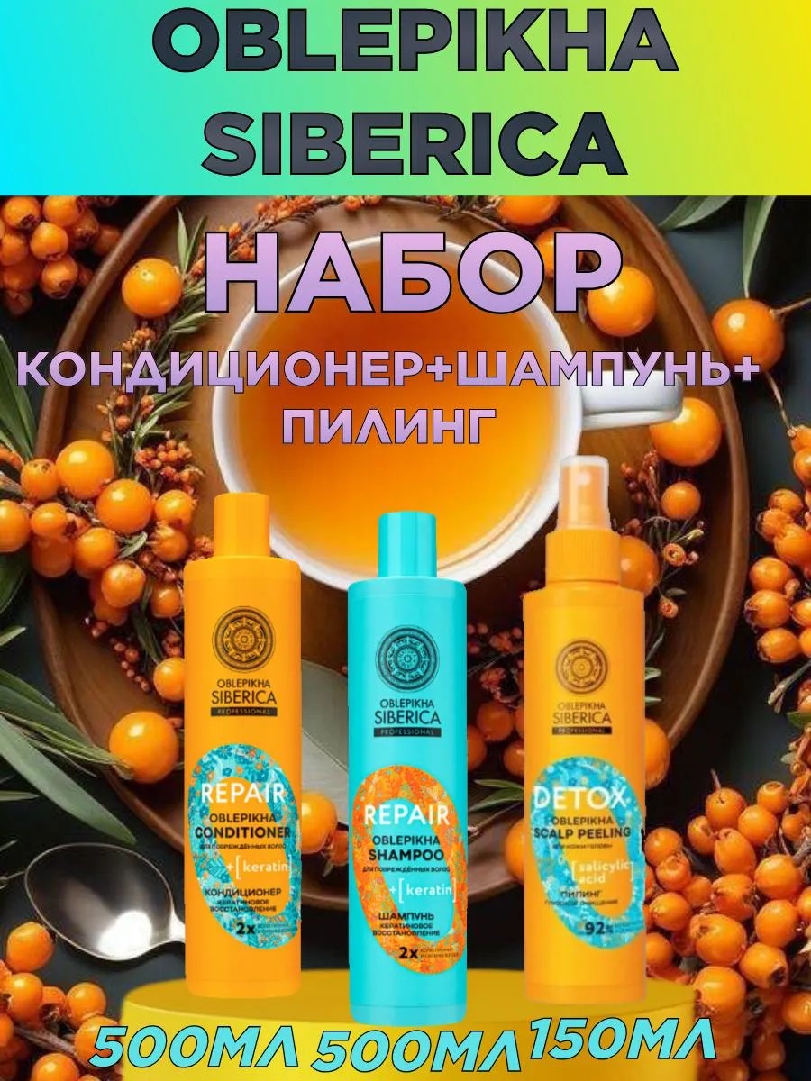 The set consists of Natura Siberica Oblepikha shampoo, conditioner, and detox peel. Keratin Repair Shampoo and Conditioner for Damaged Hair gently cleanse the scalp and hair of impurities, restore hair structure, and protect against further damage. The conditioner prevents breakage and split ends, adding shine. Plant-based Keratin, contained in both products, penetrates damaged areas of hair and restores hair structure from the inside. Altai sea buckthorn oil enriches hair with vitamins, enhancing the regenerative process. Kamchatka Edelweiss, Khakassian Sophora, and Rose Rhodiola nourish hair and smooth the cuticle layer. Pro-Liposome is a unique system for transporting active ingredients into the hair and scalp. The scalp peeling baby deeply cleanses, removes impurities and styling product residue, and leaves a long-lasting feeling of freshness and cleanliness.