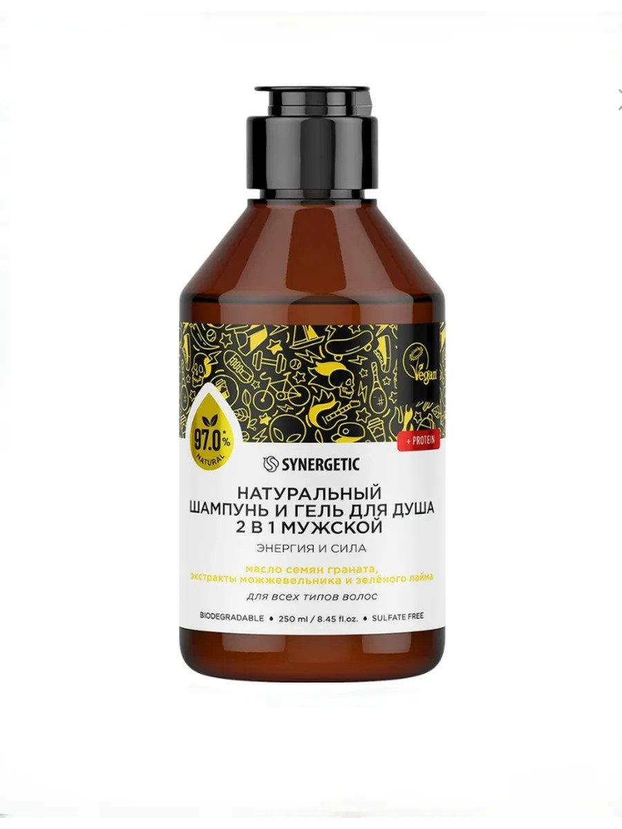 Бессульфатный мужской шампунь и гель для душа 2 в 1 Synergetic Энергия и сила — эффективное средство для очищения тела, кожи головы и всех типов волос — более чем на 98% состоит из натуральных компонентов. Бессульфатный шампунь и гель для душа 2 в 1 деликатно очищает и эффективно ухаживает за телом и кожей головы. Формула с протеином восстанавливает поврежденные волосы, укрепляет и оздоравливает их структуру. Натуральный шампунь содержит комплекс масел гранатовой косточки и макадамии, который оказывает восстанавливающее действие. Активные компоненты в составе шампуня укрепляют волосы и стимулируют формирование кератиновых волокон. Экстракты сандала, можжевельника и зеленого кофе активизируют волосяные луковицы и стимулируют рост волос. Мультифункциональный компонент натурального происхождения софоролипид мягко очищает кожу головы и сохраняет естественный микробиом, а инновационный увлажняющий комплекс усиливает барьерные свойства кожи и обеспечивает до 72 часов глубокого увлажнения. Физиологичный уровень pH 5,5 устраняет сухость кожи головы и гарантирует безопасность при частом использовании средства даже для чувствительной кожи. Натуральный шампунь не содержит SLS, SLES, парабенов, силиконов, минеральных масел и красителей, а также компонентов животного происхождения, не тестируется на животных и сертифицирован британской организацией The Vegan Society. Знак Vegan — мировой стандарт этичной продукции.