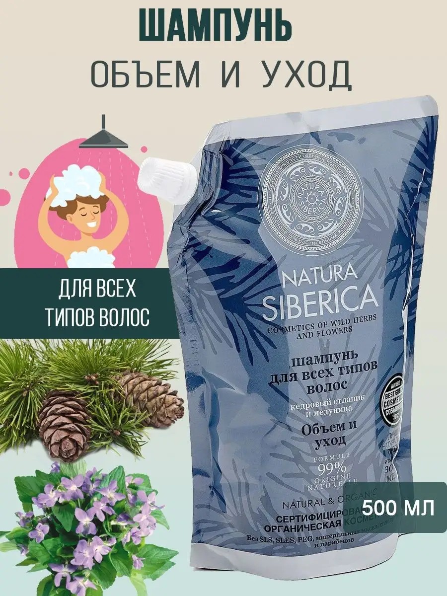 Для бережного очищения и качественного ухода за прядями, насыщения питательными веществами, придания объема, защиты от потери влаги, заметного улучшения их состояния и обретения ослепительного блеска лаборатория косметической марки **Natura Siberica** разработала специальный **шампунь для волос всех типов Объем и Уход** на основе кедрового стланика и таежной медуницы.Высокая эффективность данного продукта заключается в использовании для его изготовления высококачественных ценных и полезных ингредиентов натурального происхождения и инновационных передовых технологий. Благодаря сбалансированному сочетанию в составе кедрового стланика и экстракта медуницы таежной, которая в большом количестве содержит витамины А, В, С, Е, волосы получают качественный и мягкий уход, надежную защиту от потери влаги и негативного воздействия внешней среды, а также обретают роскошный блеск.