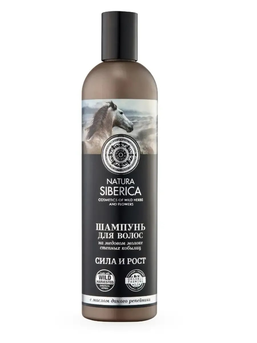 Natura Siberica, Шампунь для волос Сила и Рост Медовый Кумыс 400 мл. Подарит здоровье и силу вашим волосам, укрепляет волосы по всей длине, насыщает их аминокислотами, способствует выработке собственного коллагена. Масло дикого репейника ускоряет рост волос, делает их сильными и эластичными. Постоянное применение шампуня способствует росту здоровых волос, укреплению и восстановлению каждого волоса по всей длине изнутри и снаружи. Формула не содержит сульфатов, парабенов и силиконов, создана для мягкого и бережного ухода за вашими волосами и кожей головы.
