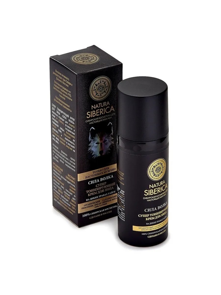 Супер тонизирующий крем для лица "Сила волка" Natura Siberica MEN 50 мл. Содержит органический сахалинский лимонник, дикую северную мяту, 100% таурин. Супер тонизирующий крем для лица "Сила Волка" создан для настоящих мужчин - сильных, смелых и уверенных в себе! Активная формула крема специально разработана с учетом всех особенностей мужской кожи и имеет четкое направленное действие. Органический экстракт нанайского лимонника, сибирского растения-адаптогена, обеспечивает стойкий омолаживающий эффект, увлажняет кожу, повышает ее эластичность, освежает цвет лица. Дикая черная мята мгновенно пробуждает, снимает отечность и покраснения. 100% таурин эффективно тонизирует, даря заряд молодости и силы. Супер тонизирующий крем для лица "Сила волка" идеально подходит для защиты кожи от стресса, усталости и пагубного воздействия городской среды. Интенсивно питает кожу, повышая ее упругость и эластичность. Мгновенно освежает и улучшает цвет лица, заряжая энергией на весь день.