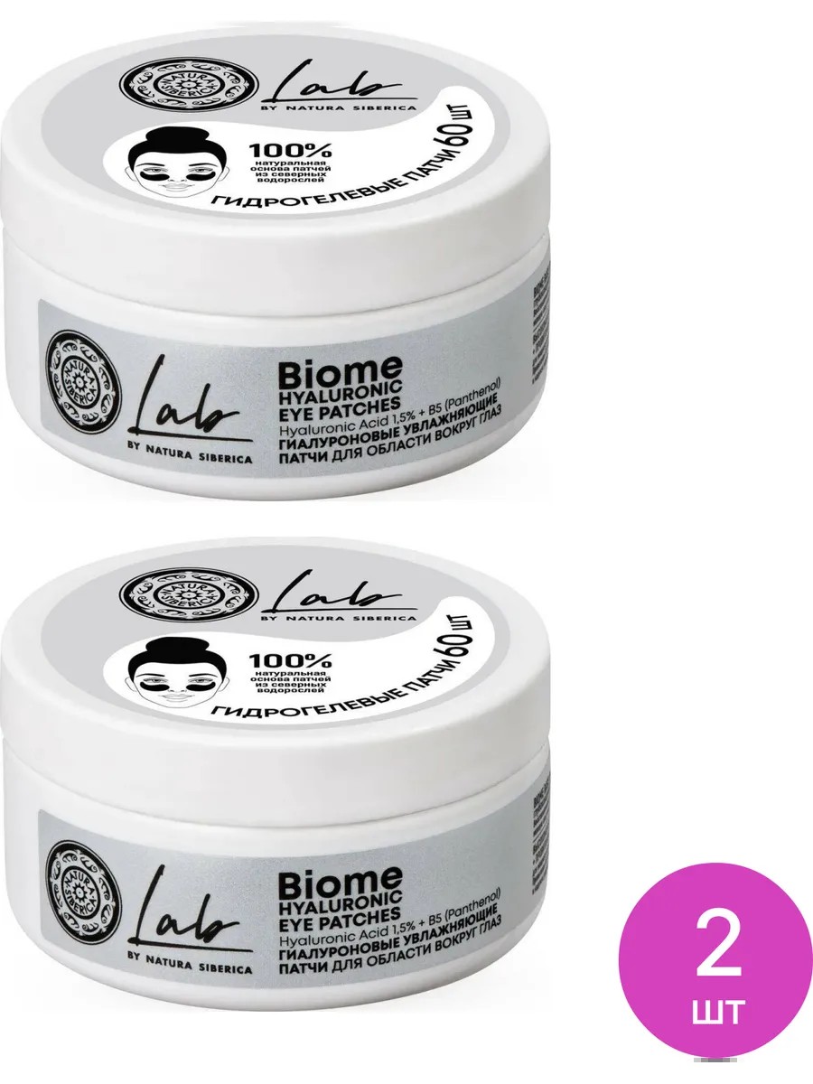 Natura Siberica / Natura Siberica Lab Biome Hyaluronic Eye Patches with Provitamin B5, Moisturizing, 60 pcs. / Anti-aging care. Set of 2. Price per set. Sometimes a tired look is hard to conceal with makeup. To address this problem, Natura Siberica Lab Biome hyaluronic eye patches effectively reduce puffiness, dark circles, and bags under the eyes, providing instant results. Fermented deep-sea kelp extract and high-molecular hyaluronic acid combine in a powerful tandem for unrivaled hydration and restoration of eyelid skin. Biome base: fermented deep-sea kelp extract restores and strengthens the skin's biome balance and its resistance to the effects of an urban lifestyle, supports delicate eyelid skin during periods of stress, and moisturizes. High-molecular hyaluronic acid + B5 - an effective combination of ingredients for maximum hydration and maintaining youthful skin. Provitamin B5 has a pronounced soothing effect and reliably retains moisture. The patches adhere tightly to the skin and stay put even during active work. This eye moisturizer smoothes wrinkles and brightens dark circles and puffiness under the eyes. Oxygenated skin will become velvety and radiant! Hydrogel eye patches / under eye patches 60 pieces / anti-aging care / hydrogel eye patches 60 pieces.