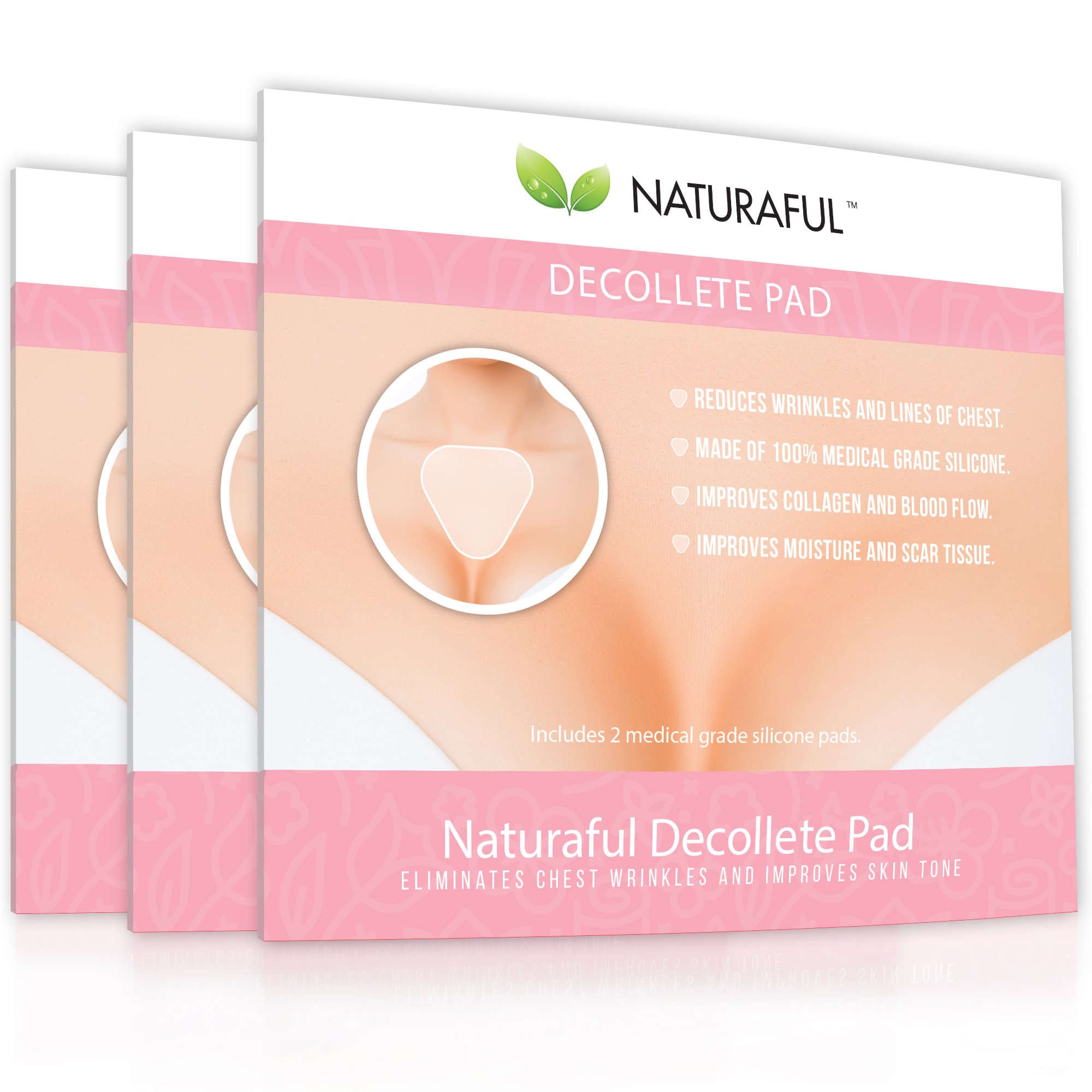 100 medical grade silicone in NATURAFUL Decollete Pad keeps the skin between your breasts firm while you sleep, which is why they work so well in preventing wrinkles. By drawing the natural skin moisture to the surface, it helps heal wrinkles faster. This also helps prevents new wrinkles and reduces the ones that already exist.