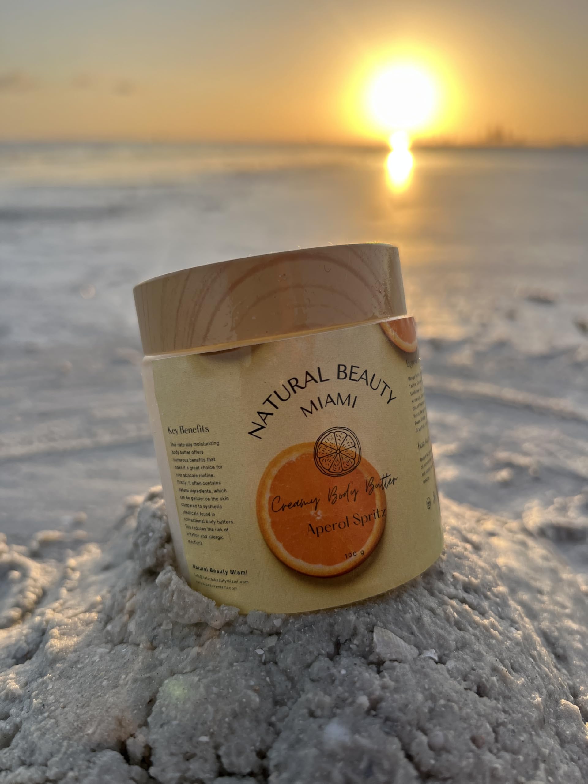 ? Summer Edition: Shimmering Aperol Spritz Body Butter ? Glow like golden hour. Hydrate like never before. Raise a glass to radiant skin with our Natural Shimmering Aperol Spritz Body Butter—a vibrant, limited-edition blend inspired by the golden sparkle of your favorite summer cocktail. Made with deeply hydrating mango butter and vitamin-rich grass-fed beef tallow, this whipped body butter melts on contact to quench thirsty skin, leaving it silky-smooth and noticeably nourished. Light-reflecting natural shimmer gives your skin a subtle sunlit glow—perfect for warm days, beach nights, and everything in between. Scented with a citrusy cocktail of bitter orange, sparkling champaign, and a hint of lemon, it's like a sip of sunshine for your skin—zesty, bright, and just a little bit indulgent. Key Ingredients Benefits: Mango Butter: Softens and smooths with rich antioxidants Beef Tallow: Deeply restorative, mimics skin's natural oils Natural Mineral Shimmer: Adds a golden, dewy finish Aperol Spritz-Inspired Scent: Fresh, effervescent, and summer-ready No synthetic fragrances, dyes, or preservatives Limited Summer Edition – Cheers to glowing skin! Because your skin deserves to sparkle this season. As always, our products are cruelty free. This product is not intended to diagnose, treat, cure, or prevent any disease. These statements have not been evaluated by the Drug and Health administration. While we do our best to provide accurate information based on studies and our own experience, you should always check with a medical professional before trying a new treatment. This is NOT a vegan product. Shelf Life: 9-12months Please make sure that you are not allergic to any of the ingredients listed in this product before purchase. It is also recommended to do a patch test by applying to an inconspicuous area and wait 24 hours and check for any allergic reactions or irritations. Discontinue use if allergic reaction occurs. NO PARABENS, DYES, GMO's, CHEMICAL FRAGRANCES or PHTHALATES. SULFATE FREE. CRUELTY-FREE, NEVER TESTED ON ANIMALS. HEAT NOTIFICATION- When ordering during hot cold months, it is important to keep watch for your package with tracking number provided to help prevent excess elemental exposure. If your Butter experiences melting, simply refrigerate your sealed product until it solidifies. The consistency may be different (whipped butter will no longer be whipped) but will still provide all of the same wonderful benefits of a natural product. Also, when a 'whipped' Butter experiences melting the contents of the jar will be less than full when it solidifies. Be assured that you are still receiving the same amount had the product not melted. If your product freezes, let it thaw naturally at room temperature. Thank you for your understanding when ordering during extreme temperatures!Nourishing, Hydrating, Golden Shimmer, Luxury Smell.