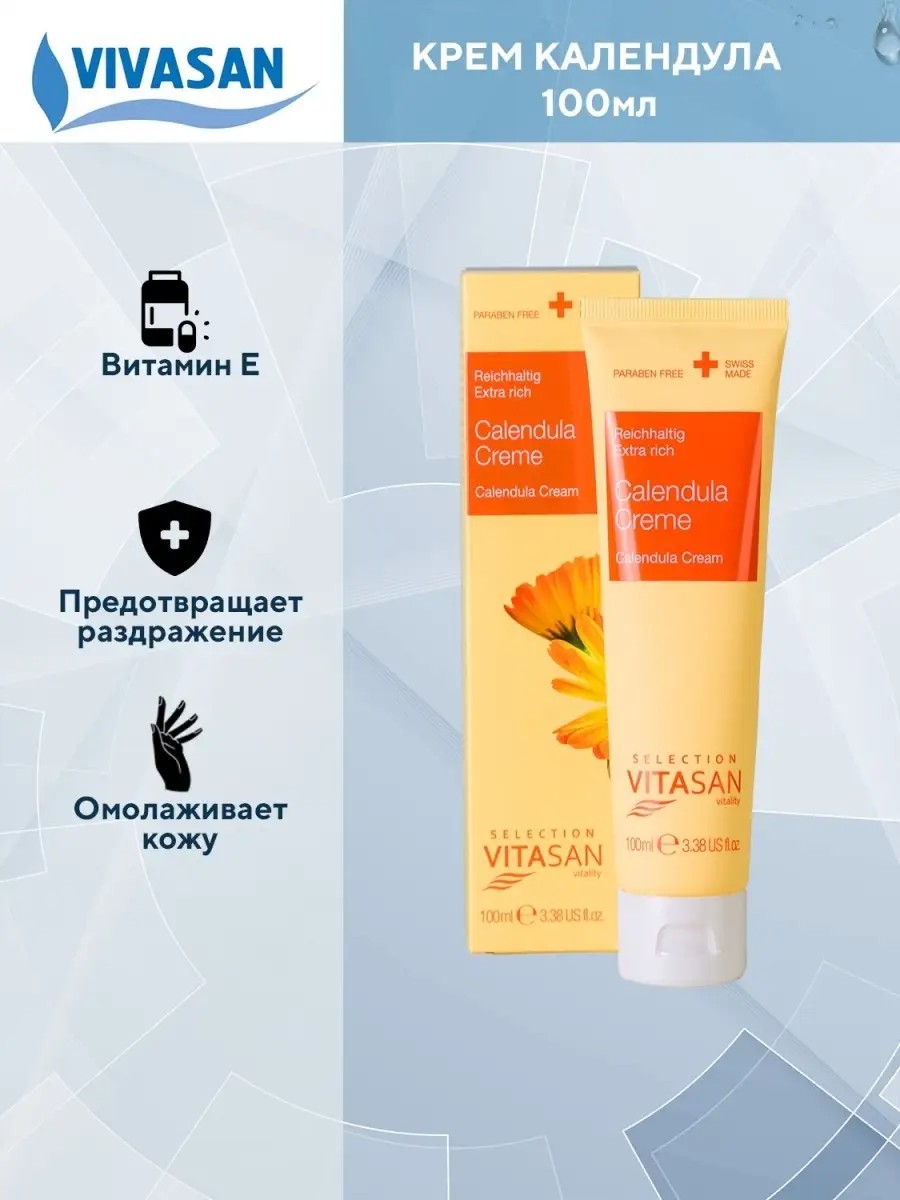 Натуральный КРЕМ для тела КАЛЕНДУЛА 100 МЛ ВивасанИнтенсивный, экстраобогащенный крем с экстрактом календулы и витамином Е обеспечивает чувствительной коже особо мягкий уход и восстановление. Предотвращает раздражение. Защищает кожу от преждевременного старения.