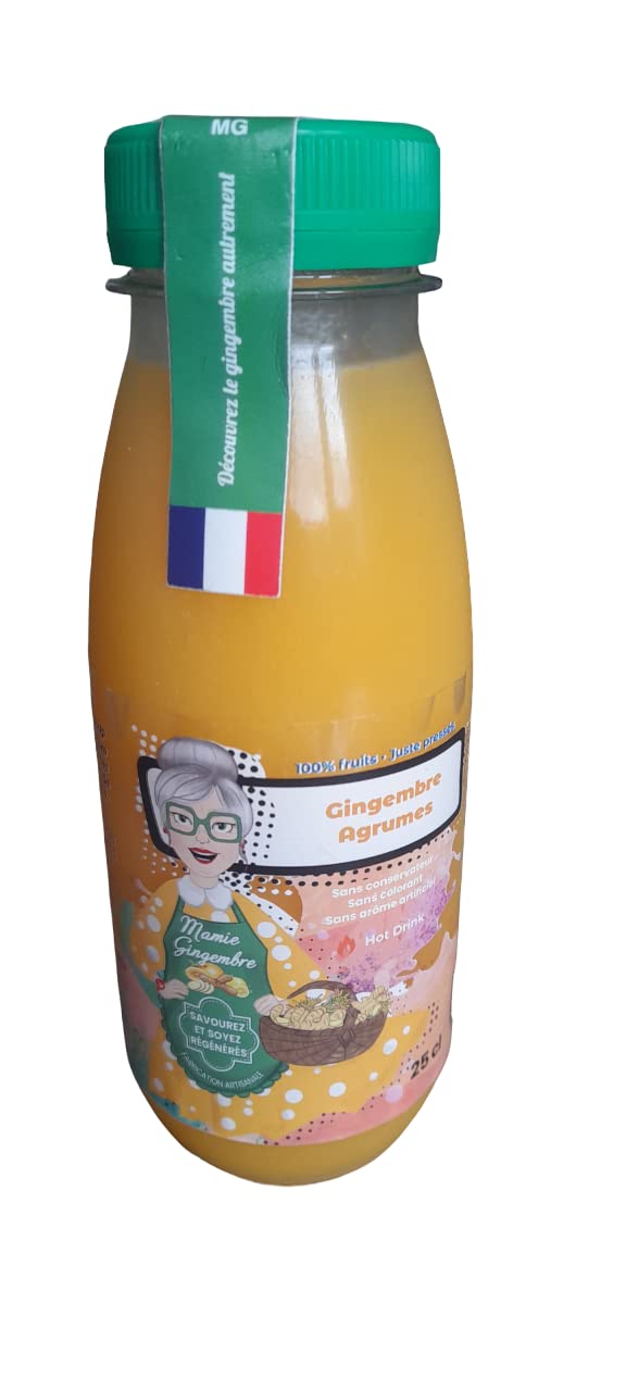 MAMIE GINGEMBRE offers juices made with fresh ginger. All our drinks are handcrafted. We take the time to select our fruits, which are then cold-pressed to preserve all their properties. INGREDIENTS ginger, citrusUSE: Serve chilled. If you can't stand the spiciness, you can dilute it. INGREDIENTS: 35 ginger, 50 citrus. DISCOVER GINGER IN A DIFFERENT WAY: MAMIE GINGEMBRE offers a delicious ginger juice. Fill up on energy naturally with this blend of ginger and fruits richest in vitamin C. NATURAL CITRUS GINGER JUICE MAMIE GINGEMBRE: When ginger meets our favorite citrus fruits. An explosion of flavor and more vitality. MAMIE GINGEMBRE propose des jus à base de gingembre frais. Toutes nos boissons sont fabriquées de façon artisanale. Nous prenons le temps de sélectionner nos fruits qui sont ensuite pressés à froid pour le maintien de toutes leurs propriétés. INGRÉDIENTS gingembre, agrumesUTILISATION : Servir frais. Si vous ne supportez pas le piquant, vous pourrez le diluer. INGREDIENTS : 35 gingembre, 50 agrumes. DECOUVREZ LE GINGEMBRE AUTREMENT : MAMIE GINGEMBRE offre un jus de gingembre savoureux. Faites le plein d'énergie naturellement grâce à ce mix entre le gingembre et les fruits les plus riches en vitamine C. JUS NATUREL DE GINGEMBRE AUX AGRUMES MAMIE GINGEMBRE : Quand le gingembre rencontre nos agrumes préférés. Une explosion de saveur et plus de vitalité.