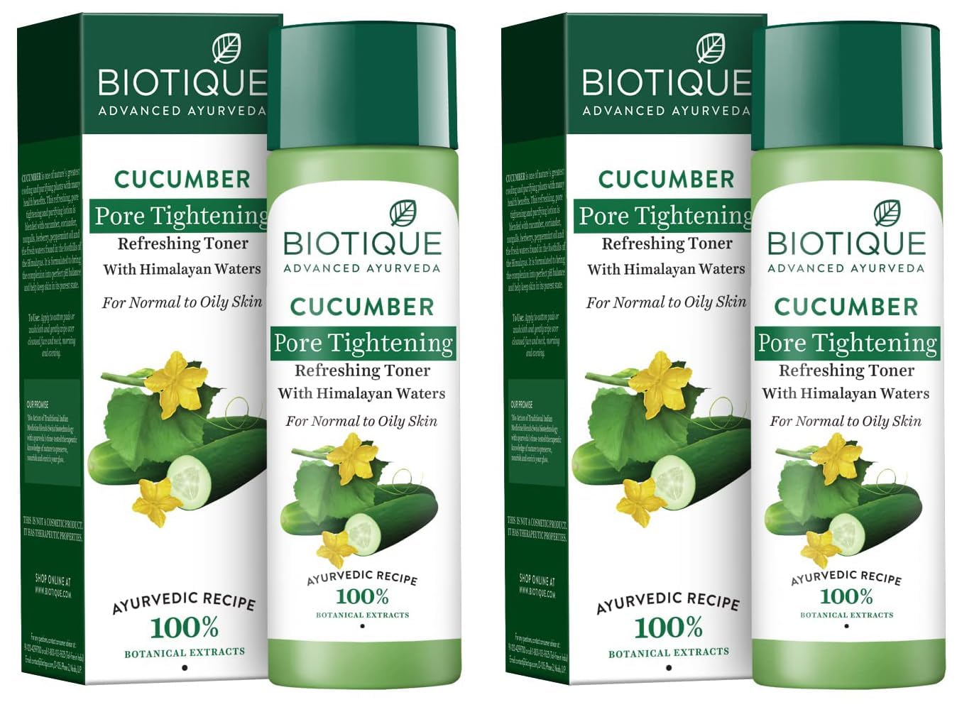 GENEROUS SUPPLY: Includes two 120mL bottles for extended use, making it a cost-effective addition to your skincare routine. AYURVEDIC FORMULA: Traditional Ayurvedic principles combined with modern skincare science for optimal skin health and balance. SKIN TYPE COMPATIBILITY: Specially designed for normal to oily skin types, helping to control excess oil without over-drying. PH BALANCED: Helps maintain skin's natural pH level while cleansing and toning, promoting healthier-looking complexion. NATURAL INGREDIENTS: Formulated with pure cucumber extract and 100 botanical ingredients for gentle yet effective pore tightening and skin balancing effects.