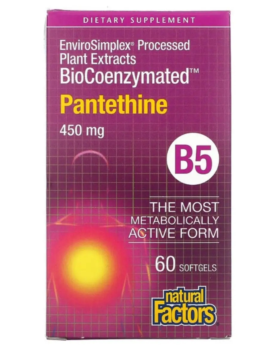 BioCoenzymated, B5, Pantethine, 450 mg, 60 Capsules Pantethine helps maintain normal cholesterol production and regulates lipid deposition in the liver, thus it can promote a healthier distribution of lipids in the body. A deficiency of vitamin B5 affects all organ systems, primarily the central nervous system, musculoskeletal system, gastrointestinal tract, skin, and excretory system. Symptoms of pantothenic acid deficiency include, first and foremost, a burning sensation in the toes, lethargy, apathy, and fatigue. B vitamins are particularly beneficial for men. They normalize the nervous system, help produce energy, increase testosterone synthesis, protect the liver, regulate protein absorption, and make the body more resilient to external harmful influences. Dietary supplement: Plant extracts processed using EnviroSimplex technology. The most metabolically active form. Contains Pantesin. Purity and potency guaranteed. For B vitamins to be effectively absorbed by the body, they must be converted into their metabolically active coenzyme forms. For example, pantethine is the coenzyme form of pantothenic acid. A coenzyme is a naturally occurring compound that interacts with certain enzymes and promotes a number of beneficial metabolic reactions in the body. Without a coenzyme, an enzyme cannot stimulate the biochemical reaction responsible for our survival. This dual interaction between the coenzyme and the enzyme is called coenzymation. Taking B vitamins in their coenzyme forms allows the body to utilize them directly. This means the body requires fewer of these vitamins, while maintaining the same benefits. BioCoenzymated goes even further. Using our proprietary EnviroSimplex technology, we've created a unique BioCoenzymated biocoenzymation process using organic, whole-food plant extracts from fresh, agriculturally grown plants and coenzyme B vitamins. The synergy of the phytochemicals in these plant extracts and coenzyme B vitamins optimizes absorption. BioCoenzymated delivers the most metabolically active nutrients for maximum cell utilization. Pantothenic acid (vitamin B5) is an essential nutrient used in the synthesis of coenzyme A (CoA), a cofactor for many metabolic processes. Coenzyme A is important for the metabolism of carbohydrates, lipids, proteins, and energy. Pantethine is the coenzyme form of vitamin B5. Taking pantethine promotes improved absorption and bioavailability compared to non-coenzyme forms. Pantethine helps maintain healthy serum lipid levels and plays a vital role in cardiovascular health due to its antioxidant properties. Natural Factors uses proprietary Pantesin, a high-quality form of pantethine.