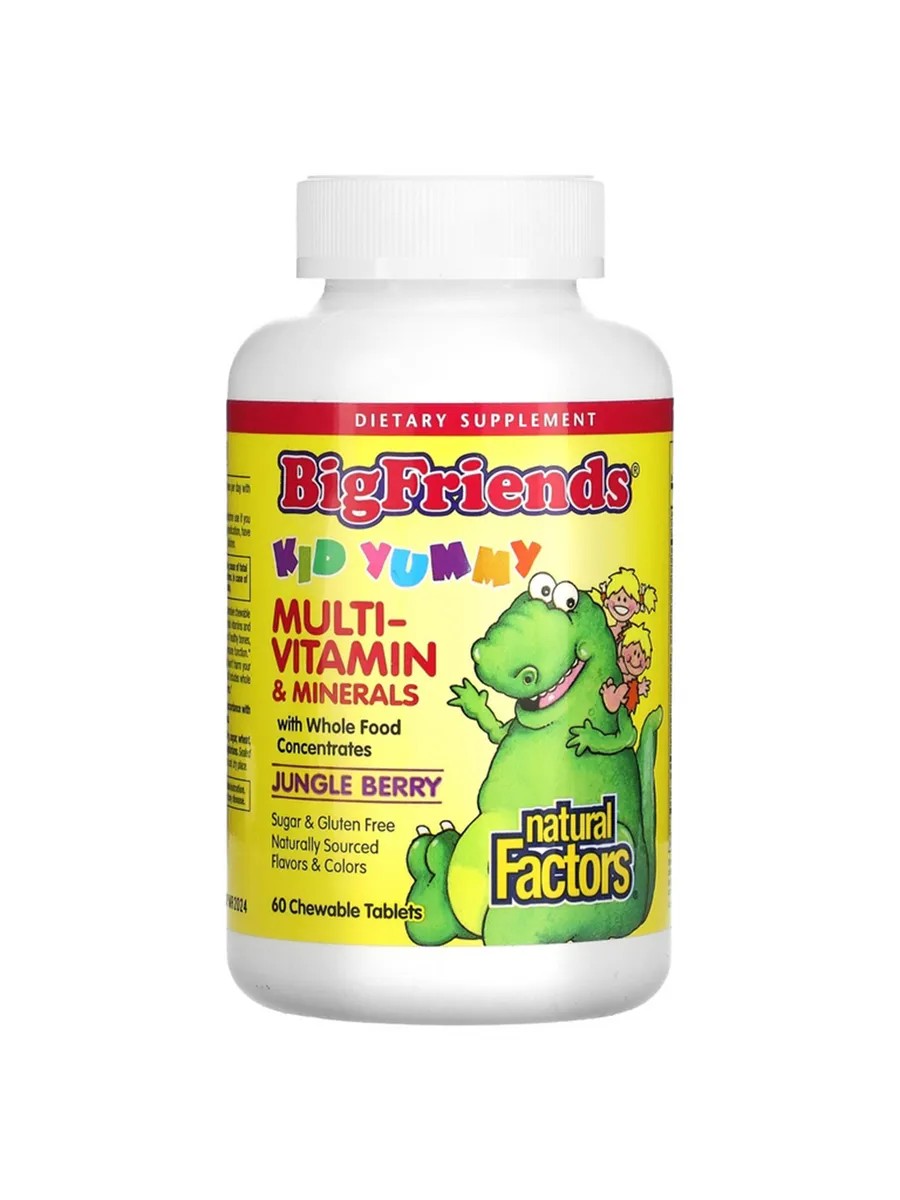 Жевательные мультивитамины Big Friends — это комплексная и вкусная жевательная мультивитаминная и минеральная формула, подслащенная ксилитом, который, в свою очередь, является здоровой альтернативой сахару для детей и не вредит их зубам. Продукт создан для поддержания крепкого здоровья активных и растущих детей в возрасте от 3 лет и старше. Помогает в развитии и поддержании здоровья костей, зубов, десен и зрения. Так же поддерживает барьерную функцию,ночное зрение, здоровье кожи и иммунной системы.