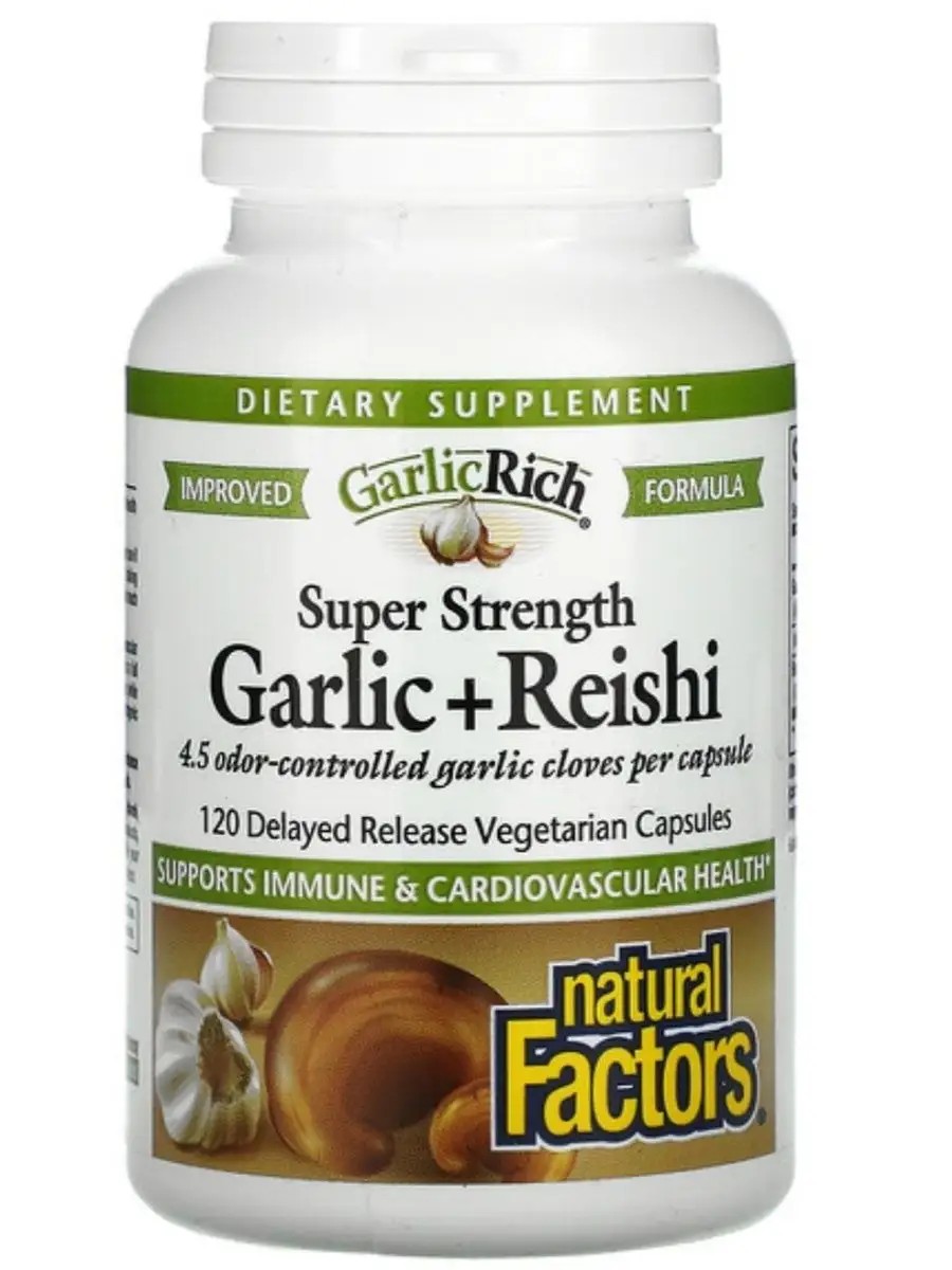 Чеснок Рич Супер Сильный Чеснок + Рейши, GarlicRich Super Strength Garlic Reishi, Natural Factors 120 вегетарианских капсул суперсила чеснока рейши с отсроченным высвобождением .Пищевая добавка.