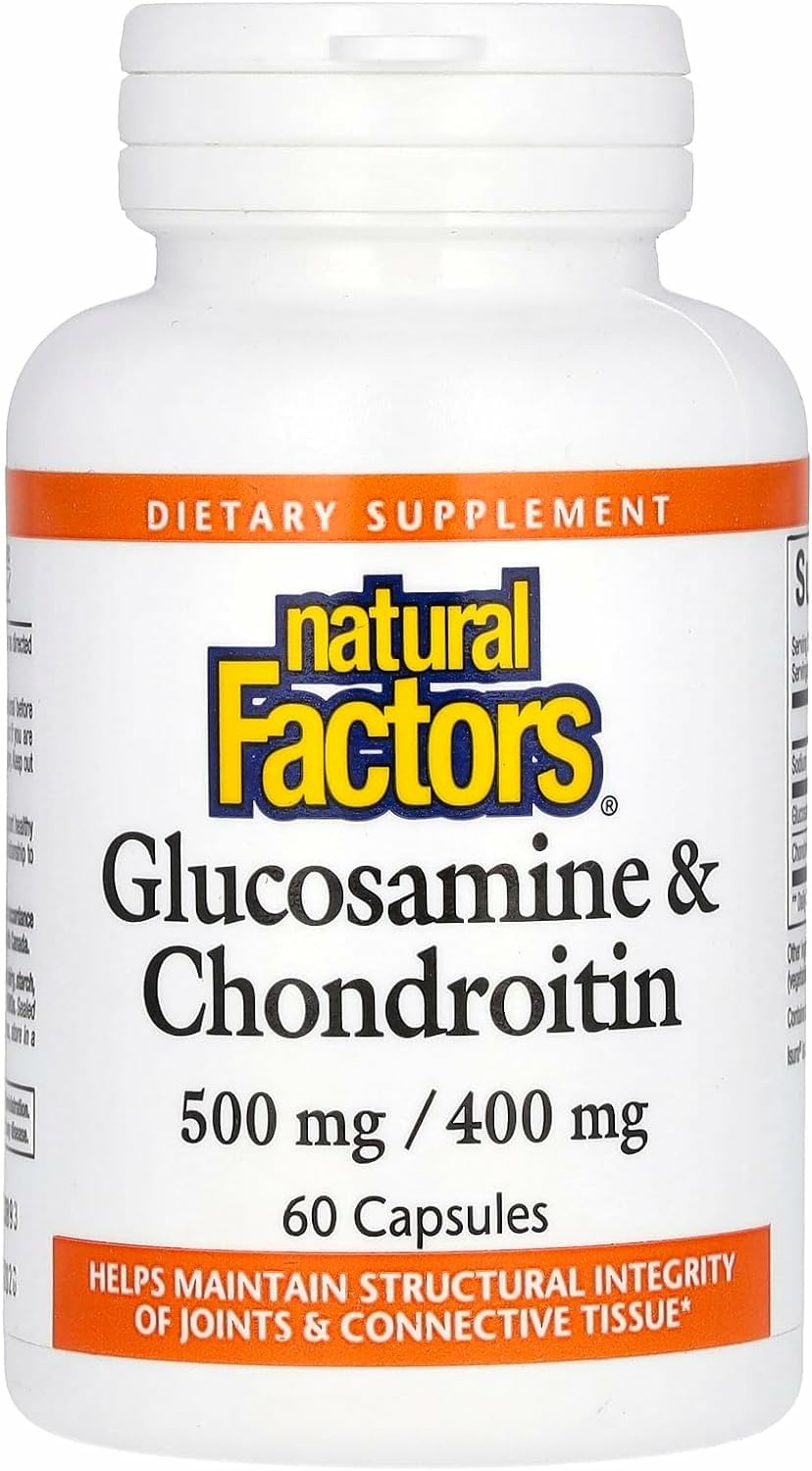 Support your joints with a time-tested blend of two of the most researched ingredients in —glucosamine sulfate and chondroitin sulfate. Natural Factors Glucosamine Chondroitin is expertly formulated to support healthy cartilage and other connective tissue. Whether you're looking to stay active or support your body through the natural effects of aging, this daily supplement helps keep you moving with ease. Each serving delivers doses of glucosamine, which helps your body maintain healthy cartilage, and chondroitin, which supports joint lubrication and cushioning for smooth, flexible movement. Ideal for athletes, aging adults, or anyone needing joint support, this formula is made with naturally sourced ingredients, free from artificial preservatives or sweeteners. Just three easy-to-swallow capsules daily is all it takes to support long-term . True ownership sets Natural Factors apart. As a family-owned company, we have direct ownership of all product manufacturing stages and, unlike most brands, we uniquely control every step from ingredient sourcing to final supplement. This includes sourcing from our own organic farms where we've been practicing regenerative farming for over thirty years. Our research-supported formulas are developed by our diverse medical team to deliver highly effective products with meaningful levels of ingredients that deliver results to you. Natural Factors products are third-party by ISURA to be non-GMO and tested for over 800 contaminants and adulterants, providing additional assurance of unparalleled purity and quality. We're committed to doing business sustainably and with integrity and are proudly BCorp and Carbon-Neutral . For over 60 years, we've demonstrated our unwavering commitment to quality, making Natural Factors a supplement brand you can trust.About Natural Factors: Natural Factors is a family-owned B-Corp, Carbon Neutral, and 3rd Party with direct ownership of all manufacturing stages to ensure the highest quality supplements. Non-GMO, Gluten-Free Dairy-Free: This dietary supplement is free from artificial preservatives, colors, and sweeteners it is also made to be non-GMO, gluten-free, dairy-free, and sugar-free. Daily Use for Results: Formulated with naturally sourced ingredients to support your joints with optimal strength and consistency . Connective Tissue Repair Support: Features glucosamine sulfate to help build cartilage and chondroitin to aid joint lubrication for smooth, flexible movement . Joint Support Formula: Natural Factors Glucosamine Chondroitin provides comprehensive joint support and supports healthy connective tissue .