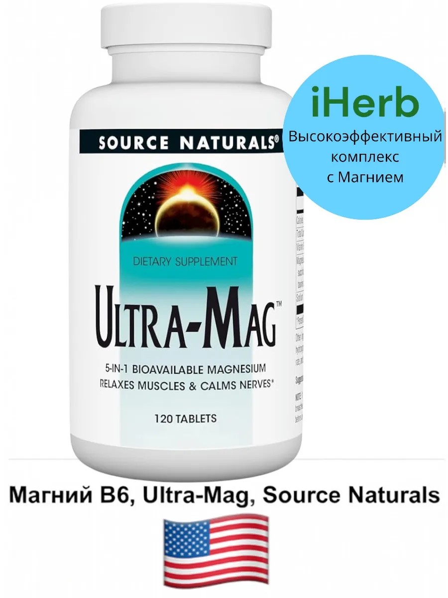 iHerb Vitamins Magnesium for Cardiovascular and Nervous System Health Ingredients / Vitamin B-6 (as pyridoxine HCl), magnesium (as magnesium citrate, succinic acid complex, glycinate, malate, and taurine complex), and sodium. Source Naturals Ultra-Mag High-Potency Magnesium Complex - Supports Muscle and Nerve Function - 120 Tablets Flavor Unflavored An essential nutrient for brain, heart, and nervous system health. May reduce stress by regulating serotonin levels. Helps regulate the nervous system and lowers homocysteine levels. Vitamin B6 supports energy metabolism and nervous system health Magnesium vitamins Vitamins for women and men; stress reliever; for the nervous system, antidepressant Magnesium: calms the nervous system, relieves anxiety and excitability, ensures deep sleep.