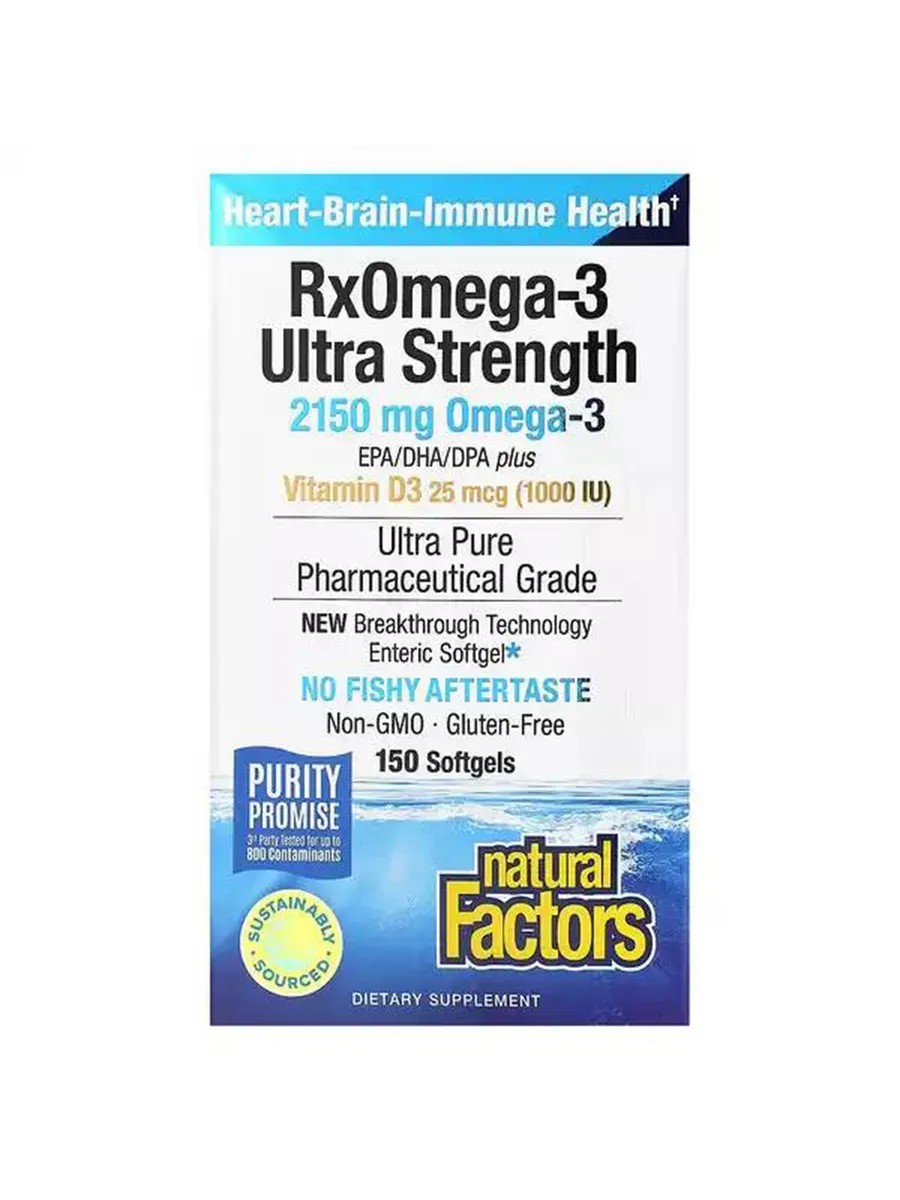 RxOmega-3 с витамином D3 повышенной силы действия из экологически чистой рыбы дикого улова обеспечивает высочайшую концентрацию подтвержденных исследованиями омега-3, ЭПК и ДГК, а также ДПК натурального происхождения.