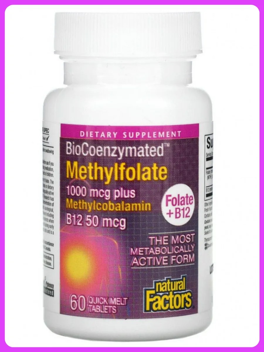 Уникальная пищевая добавка BioCoenzymated от Natural Factors объединяет в себе метилфолат 1000 мкг и метилкобаламин B12 (50 мкг).