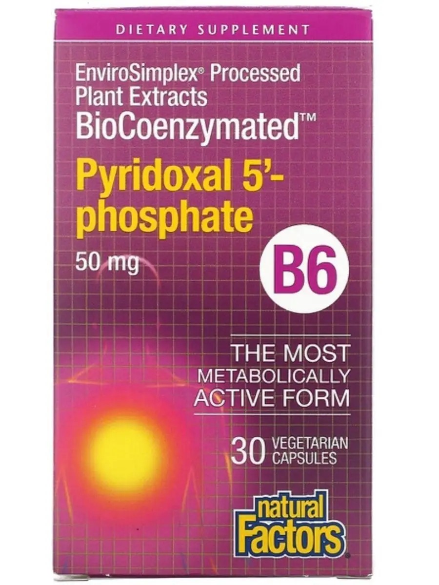 Pyridoxal 5 phosphate Natural Factors Dietary supplement B6 vitamin B6 Biocoenzymated pyridoxal 5 phosphate, 50 mg, 30 vegetarian capsules. Dietary supplement. Vitamin B6 is also essential for the proper functioning of the central and peripheral nervous system. It is also involved in fat and protein metabolism, helps maintain the health of the liver, eyes, skin, and hair. Vitamin B6 has a beneficial effect on the health of the cardiovascular system. What are the symptoms of vitamin B6 deficiency? The main symptoms of vitamin B6 deficiency? Fatigue, depression; hair loss; "Cracks" in the corners of the mouth. How is vitamin B6 beneficial for women? Pyridoxine (vitamin B6) is especially important for women's health, as it maintains sex hormone balance, stimulates metabolism, affects appearance, and reduces the risk of breast cancer. What diseases develop with vitamin B6 deficiency? Vitamin B6 deficiency causes peripheral neuropathy and pellagra-like syndrome with accompanying seborrheic dermatitis. Pyridoxine is involved in the production of serotonin, and therefore affects the nervous system. The most metabolically active form. Suitable for vegetarians and vegans. Purity and potency guaranteed. Directions for use: 1 capsule daily or as directed by a physician. What does "coenzymation" mean? For B vitamins to be effectively absorbed by the body, they must be converted into their metabolically active coenzyme forms. For example, the coenzyme form of vitamin B6 is pyridoxal-5-phosphate. A coenzyme is a naturally occurring compound that interacts with certain enzymes and facilitates a number of beneficial metabolic reactions in the body. Without the coenzyme, the enzyme cannot stimulate the biochemical reaction responsible for our survival. This dual interaction between the coenzyme and the enzyme is called coenzymation. Taking B vitamins in their coenzyme forms allows the body to utilize them directly. This means the body requires fewer of these vitamins, while the benefits remain intact. BioCoenzymated goes even further. Using our proprietary EnviroSimplex technology, we've created a unique BioCoenzymated biocoenzymation process using fresh, organic whole-food plant extracts and coenzymated B vitamins. The synergy between the phytochemicals in these plant extracts and the coenzymated form of B vitamin optimizes absorption. What we've achieved? BioCoenzymated delivers the most metabolically active nutrients for maximum cell utilization. Experience the difference. Pyridoxine (vitamin B6) acts primarily as an enzyme catalyst in many bodily processes, such as energy metabolism.