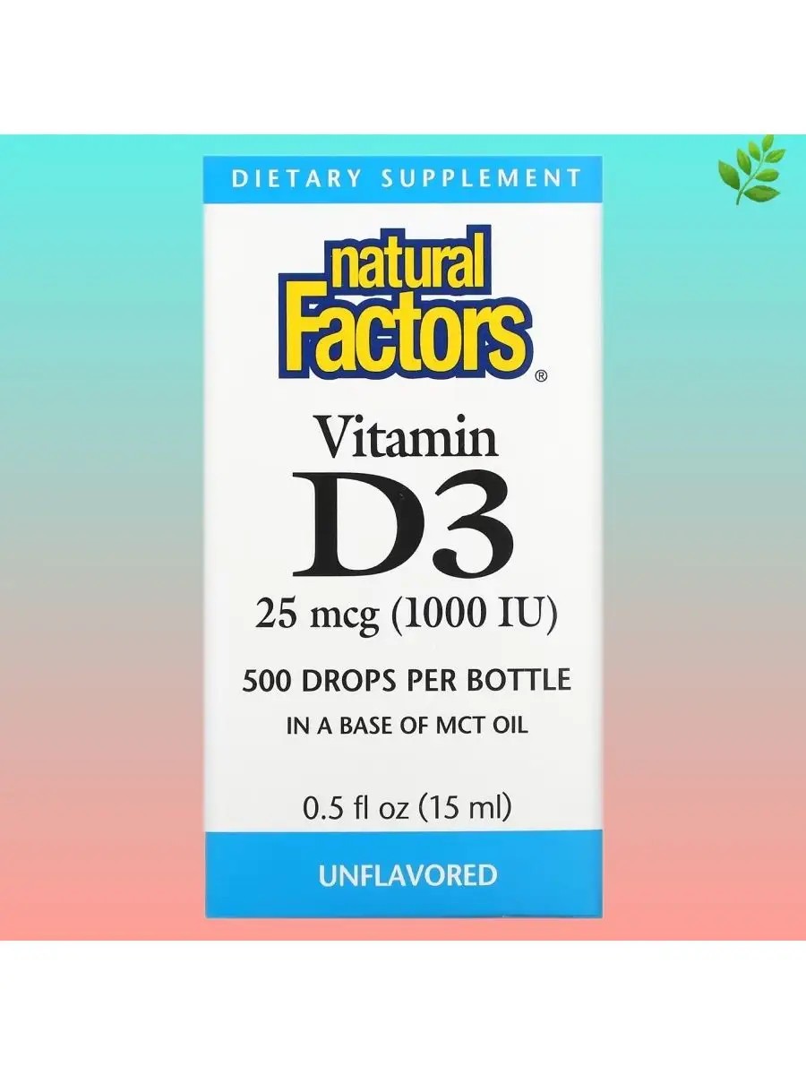 Vitamin D3 is a beneficial liquid supplement based on medium-chain triglyceride (obtained from certified organic oils - palm and coconut) and flaxseed oil, containing 25 mcg (1000 IU) of vitamin D3 in each drop.