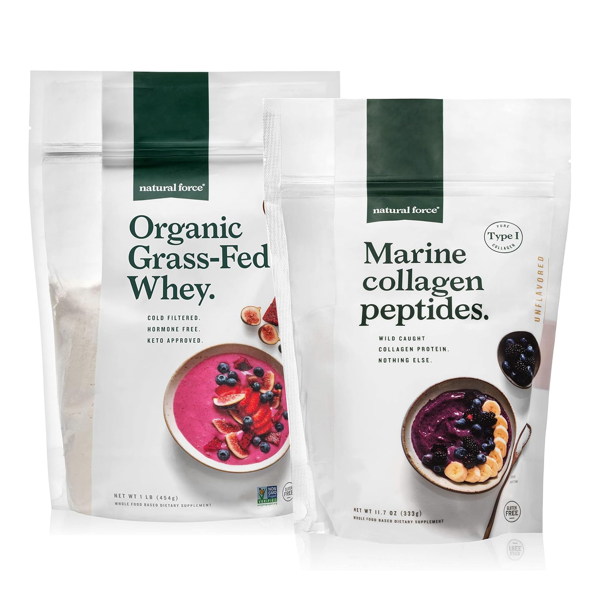 Nutrition You Can Trust - Natural Force values the health and happiness of our customers. If you have any questions, comments, or concerns, send us a message from your account and our world-class Customer Support team will help to make it right. Only 1 Ingredient - High-Purity Type I and III Natural Bioactive 100 Grass-Fed Organic Hydrolyzed Bovine Hide Collagen Peptides. Each scoop of our pure Collagen Peptides provides 10g of clean protein, 18 Amino Acids (8 Essential), and has only 40 calories and 0g of fat and carbs. These organic peptides are less refined than conventional collagen and may have a more natural taste and consistency. USDA Certified Organic - Natural Force Collagen Peptides are sustainably sourced exclusively from 100 grass-fed, pasture-raised cattle raised on Family Farms free of forced labor and located outside indigenous territories. They are never given antibiotics, hormones, or GMOs. Clean and Sustainable: This unflavored whey protein is free from artificial sweeteners, flavors, fillers, and GMOs. It is packaged in an eco-friendly, BPA-free pouch that uses 70 less plastic than standard tubs. Every batch is rigorously tested for quality and purity in a cGMP-certified facility. High-Quality Protein Source: Natural Force Organic Grass Fed Whey Protein is a pure, clean and complete protein source derived from the milk of humanely treated, grass-fed Jersey cows. Each serving provides 20g of protein with only 2g of carbs, making it ideal for those following a keto or low-carb diet.