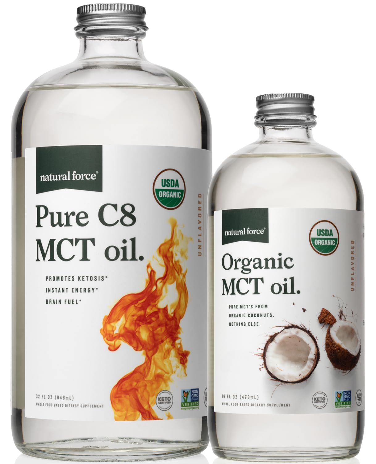 100 Health Happiness Guaranteed: We value our customers and want you to be healthy and happy. If you have any questions, comments, or concerns, simply send us a message from your account and our world-class Customer Support team will take care of you. Certified USDA Organic, Project Non-GMO, Keto, Paleo, Vegan, and Kosher: Natural Force Organic MCT oils are 3rd party certified by top organizations like QAI Organic, The Non-GMO Project, The Paleo Foundation, Vegan Action, and OU Kosher. 3rd Party Lab Tested for Gluten, Mold, Heavy Metals More: Every batch of Natural Force Organic MCT oil is 3rd party lab tested and independently analyzed to ensure the utmost quality, purity, and freshness. And, unlike other companies, we freely share the results of our testing because we have nothing to hide!. Why Natural Force? You deserve nutrition that you can trust. Unfortunately, many MCT oil products feature cheap palm oil, may contain health harming toxins, and use toxic plastic packaging. That is why we source the only sustainable, organic, and non-GMO coconuts, consciously craft them into pure, beneficial MCTs, and deliver them to you in non-toxic eco-friendly glass bottles. Pure C8 and Regular MCT Oil Bundle: This premium bundle of Natural Force Organic MCT oils gives you the quality fats you need to boost your metabolism and to get into ketosis. Simply blend 1 tbsp Organic Pure C8 MCT Oil into your morning coffee, tea, or smoothie. When cooking, use Organic MCT Oil as a replacement for unhealthy oils like corn, canola, or soy.