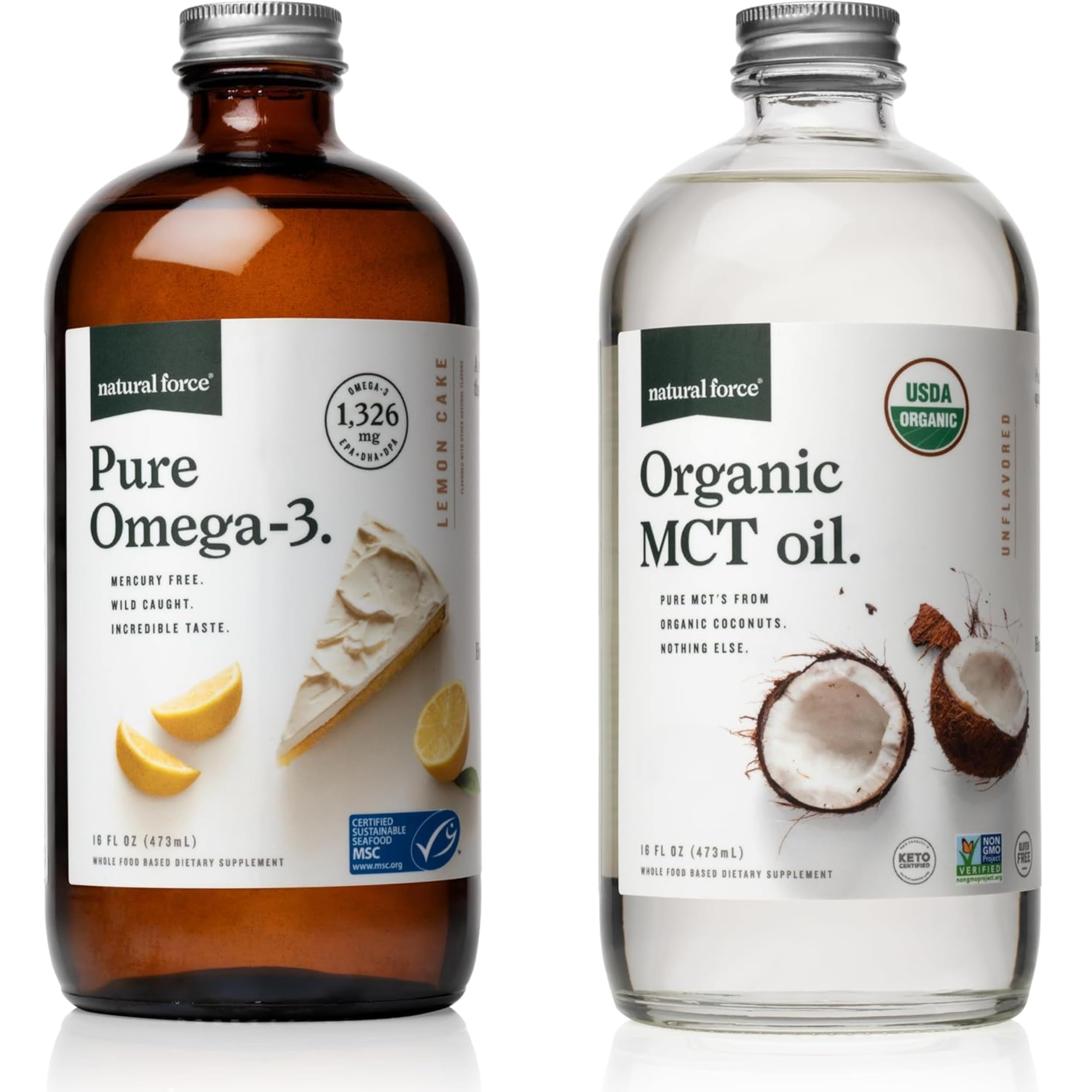 Natural Force Pure Omega 3 - Liquid Fish Oil Lemon Cake Flavor - 16 Oz Glass Bottle 100% Virgin Coconut MCT Oil - 16oz Glass Bottle