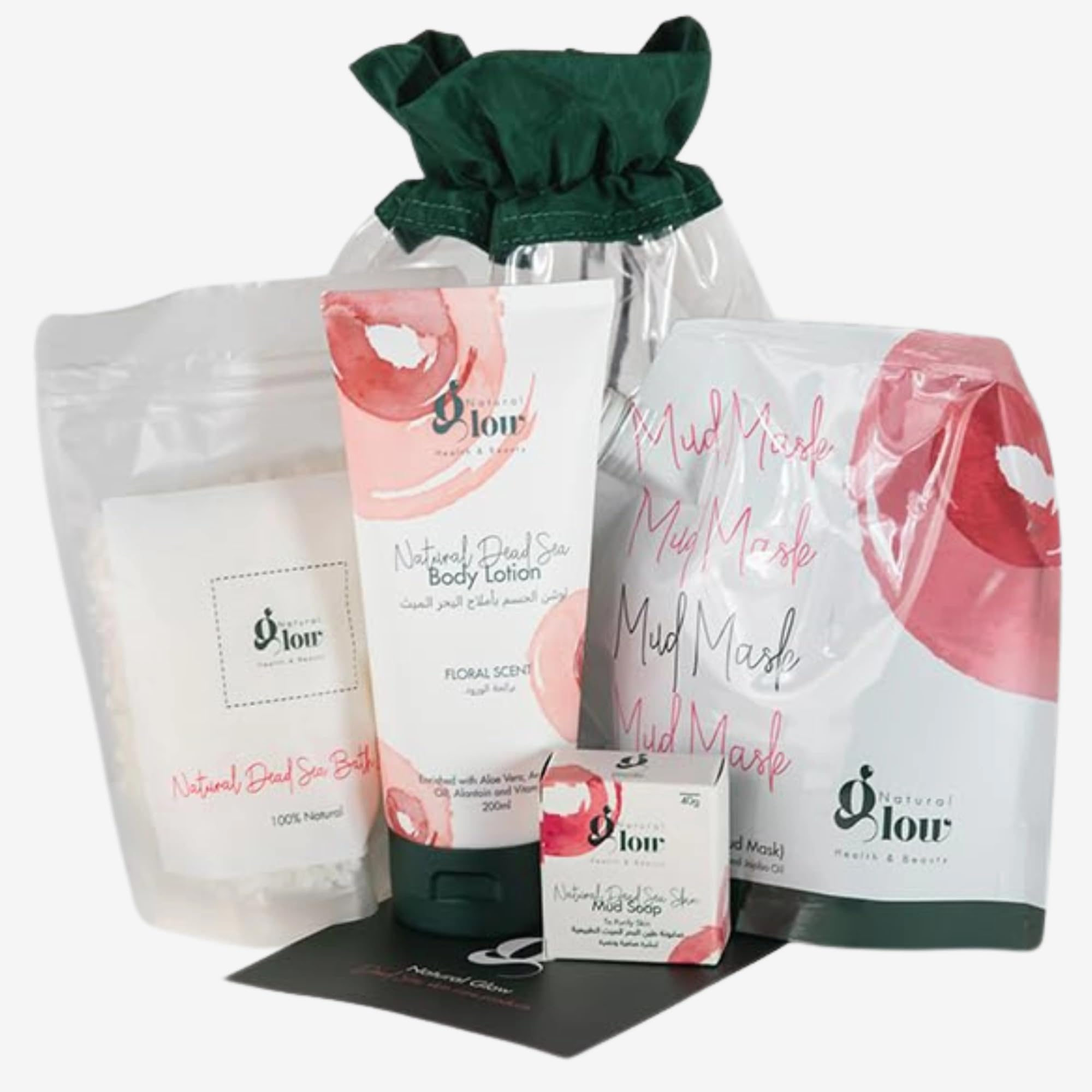 Indulge in the ultimate natural skincare ritual with the Natural Glow Dead Sea Skincare Gift Set. This luxurious 4-in-1 pouch contains a mineral-rich mud mask, bath salt, body lotion, and mud soap, harnessing the nourishing powers of the Dead Sea for a rejuvenating spa experience.