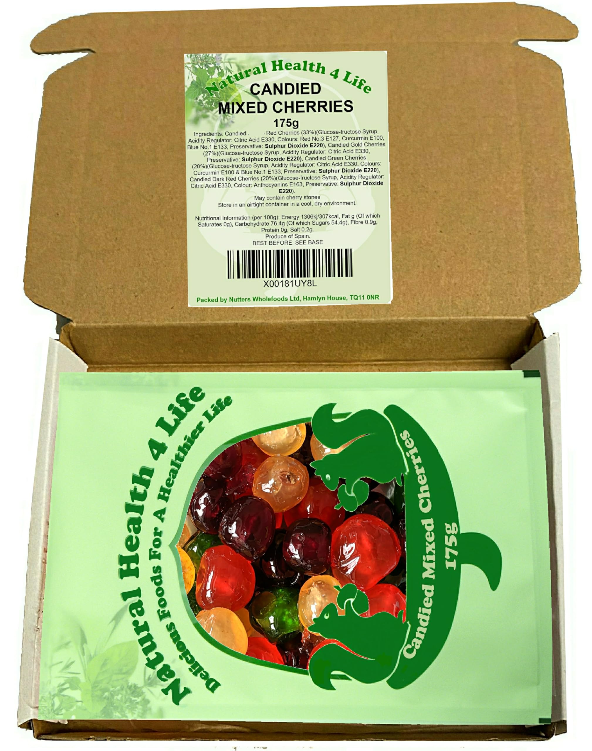 Natural Health 4 Life Glace Cherries are Perfect for Home Baking. They are Great for Cake Decorating and also for use as an Ingredient. Try Using These Cherries for Decorating a Dundee, Christmas, or fruit cake. INGREDIENTS Candied Red Cherries (33 ), Candied Gold Cherries (27 ), Candied Green Cherries (20 ), Candied Dark Red Cherries (20 ), Glucose-fructose syrup, Citric acid, Colour E100, E133, E221, E127, E163, Sulphur Dioxide. May Contain Cherry Stones