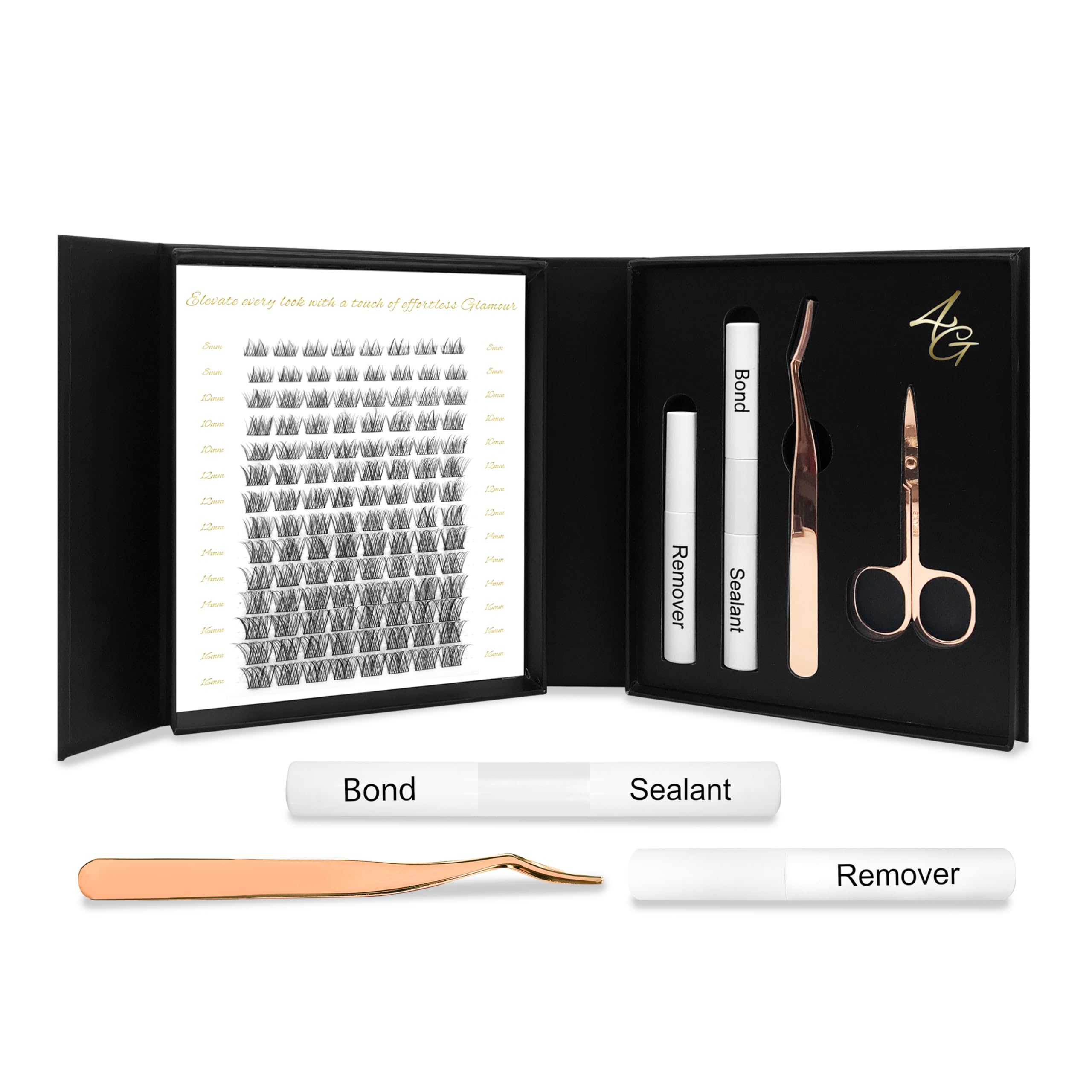 Curl Type: D. Scissors: Crafted from premium stainless steel with a rose gold finish, these scissors allow you to trim lashes to your desired length with ease. Tweezers: Designed for precise application, these tweezers help you place each lash with accuracy and ease. Lash Remover: A gentle solution for safely removing extensions without irritation, keeping your lashes healthy and intact. Bonding Glue: Secure your extensions effortlessly with the included professional-grade adhesive. It ensures a strong hold that lasts for days without damaging your natural lashes. Eyelash Extensions: Made from high-quality synthetic hair that mimic natural lashes. These extensions are lightweight and comfortable, giving your eyes a fuller, more defined appearance.