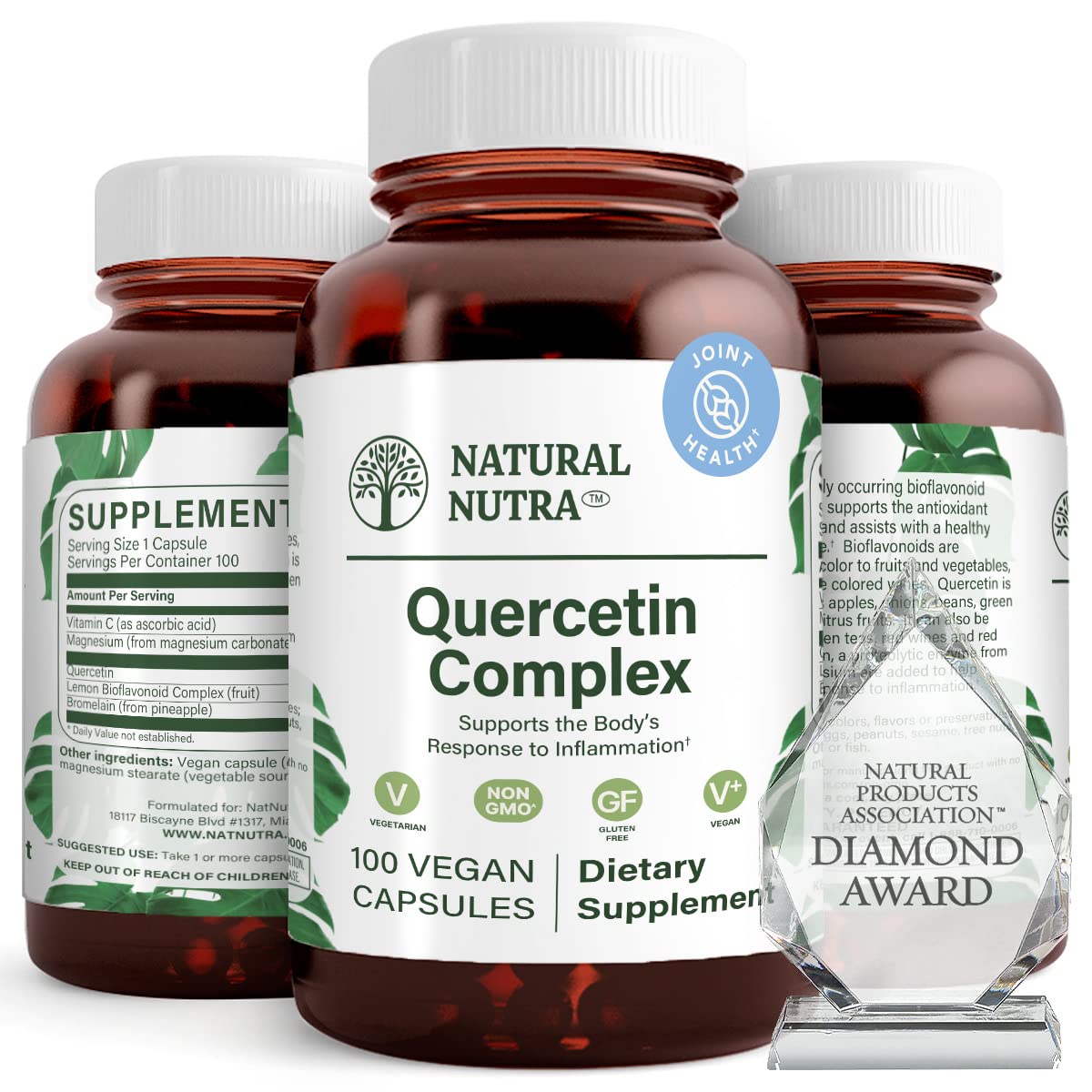 Why Choose Natural Nutra as Your Supplement Source - Natural Nutra was established with one mission in mind to provide the highest, all-natural supplements using only and socially responsible methods. Our products are proudly manufactured in the USA, are backed by extensive research and contain exactly what is presented on our labels. Ensured Purity in BPA Free, Recyclable Glass Bottles- Cheap plastic bottles are harmful to your health. We seal your supplements in amber glass bottles with heat-sealed sleeves and best by dates to ensure the safest and purest product available. Unlike some other supplement manufacturers, our bottles are fully recyclable. Each bottle contains 100 capsules that are easy to swallow, Gluten Free and Vegetarian. Quercetin Complex with Bromelain Vitamin C – Supports the body's response to seasonal changes and helps reduce redness. Enriched with citrus bioflavonoids, it promotes liver health and overall wellness. This powerful antioxidant blend helps strengthen the immune system and combat oxidative stress. This supplement is ideal for daily use to support long-term health and vitality. What Makes our Quercetin Complex Unique – In addition to Quercetin, Vitamin C has been added to support the immune system, and Bromelain plus magnesium is added. The addition of Vitamin C, Magnesium, Bromelain, and Bioflavonoids provides a complete formula for maximum results. Quercetin Supplement – Quercetin is a naturally occurring bioflavonoid compound that gives color to fruits and vegetables. Promotes skin health and supports the body to seasonal changes. Quercetin also helps to liver health and maintain glucose level in the body.