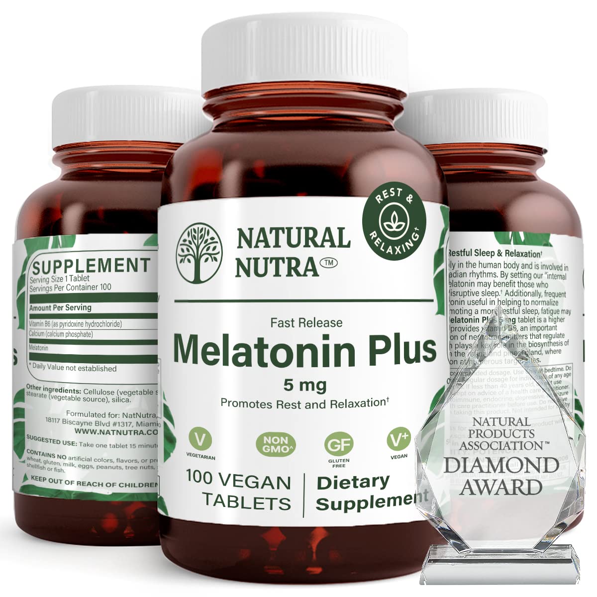 Why Choose Natural Nutra as Your Supplement Source - Natural Nutra was established with one mission in mind to provide the highest, all-natural supplements using only and socially responsible methods. Our products are proudly manufactured in the USA, are backed by extensive research and contain exactly what is presented on our labels. BPA Free, Recyclable Glass Bottles- Cheap plastic bottles are harmful to your health. We seal your supplements in amber glass bottles with heat-sealed sleeves and best by dates to ensure the safest and purest product available. Unlike some other supplement manufacturers, our bottles are fully recyclable. Each bottle contains 100 tablets that are easy to swallow, Gluten Free and Vegetarian. Quality Formulation With all Natural and Safe Ingredients for Max Absorption- Our gluten-free Melatonin 5mg is a higher dose option that also provides vitamin B6, an helpfull nutrient to regulate sleep patterns. Our fine quality formulation of 5mg Melatonin fast dissolve contains Calcium which plays a key role in the synthesis of Melatonin and improves its absorption in the body. Quick and Safe Solution to Improve Sleep -Our Melatonin 5mg extended-release supplements may benefit to improve your sleep patterns. Melatonin has been found to be very useful in helping sleep schedules and by promoting more restful sleep, our best.